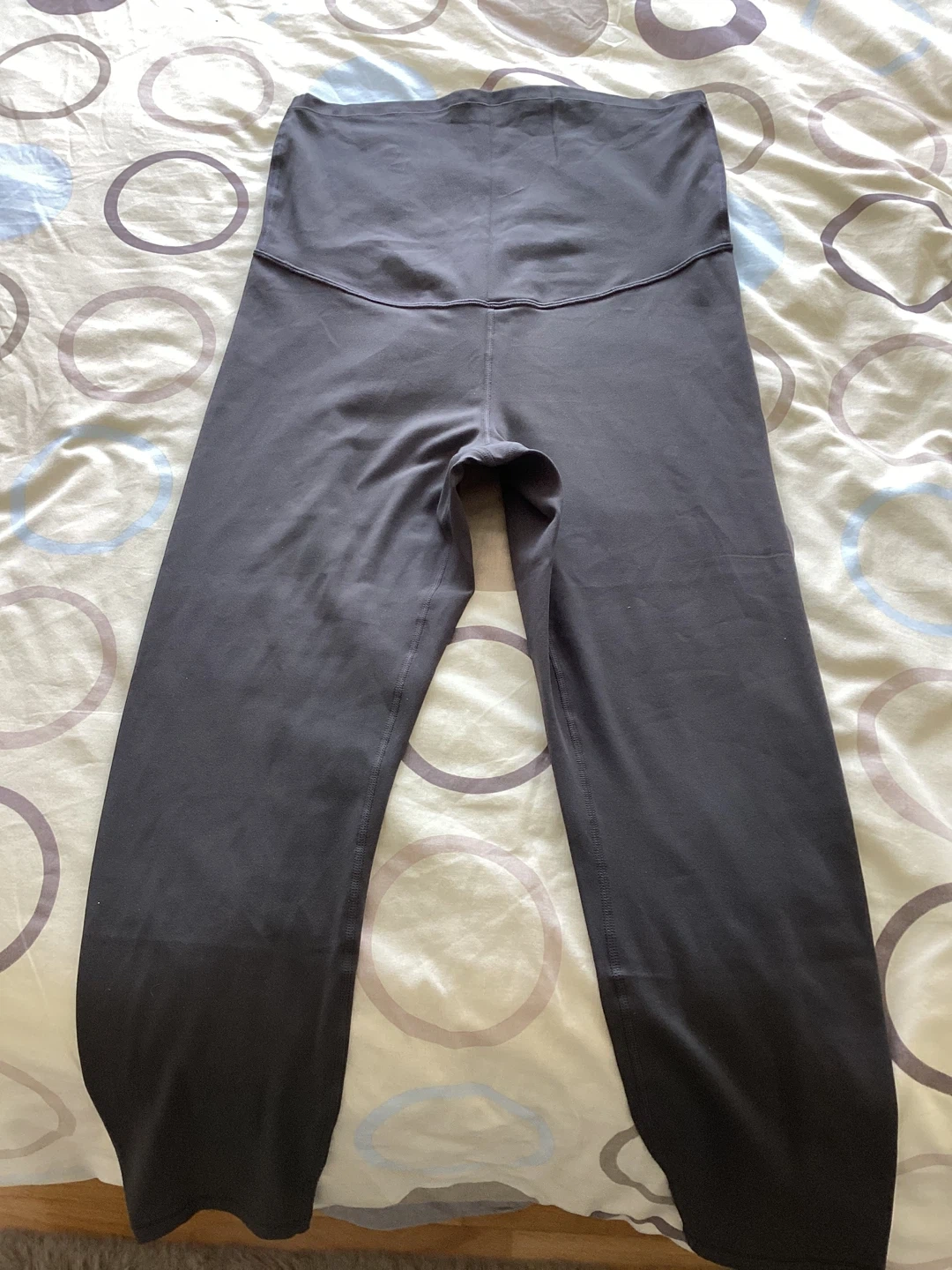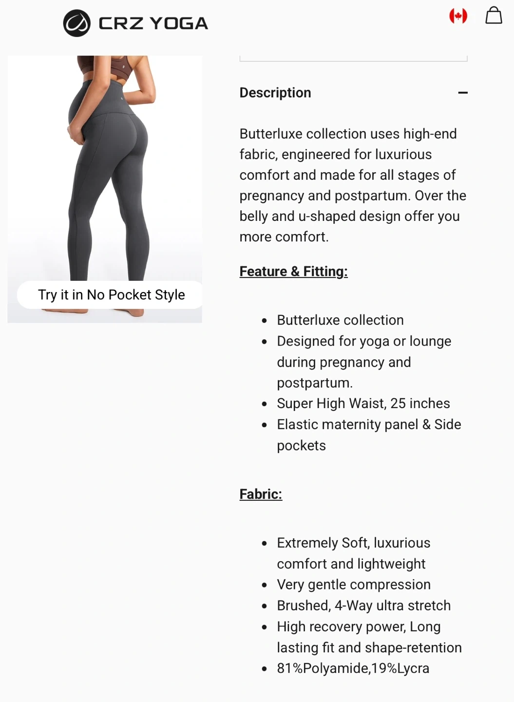 These are XL CRZ dark grey Yoga Butterluxe maternity leggings. They're made from a polyamide and lycra blend with a brushed, 4-way stretch fabric. The super high waist and elastic maternity panel offer comfort during pregnancy and postpartum. Pocketless version