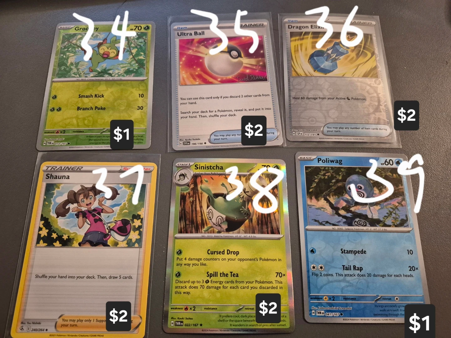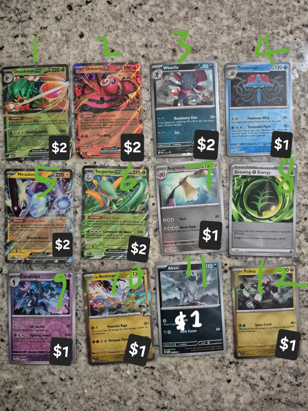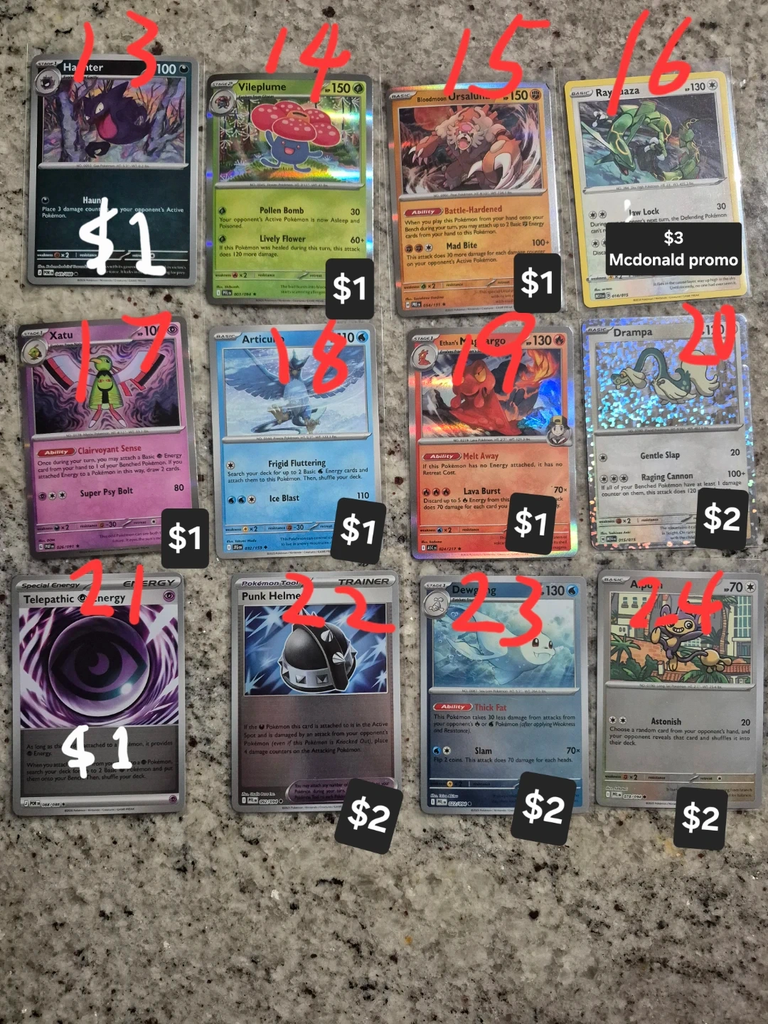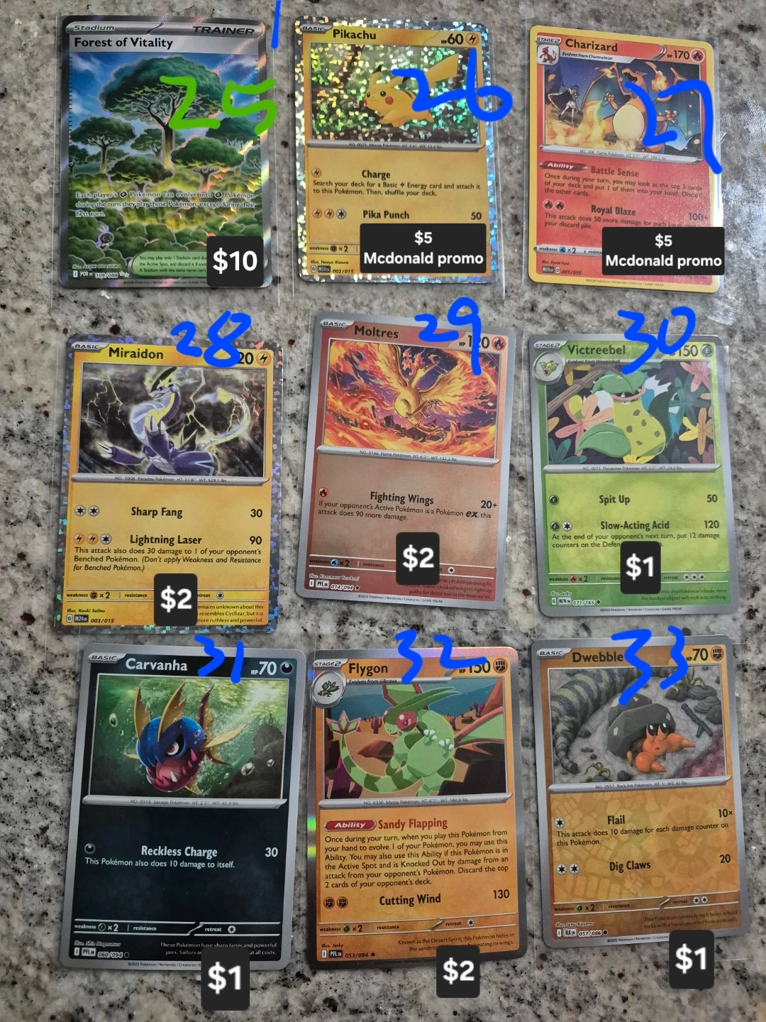 Selling a variety of Pokemon trading cards. Individual card prices are marked in the photos. All cards are in good condition.