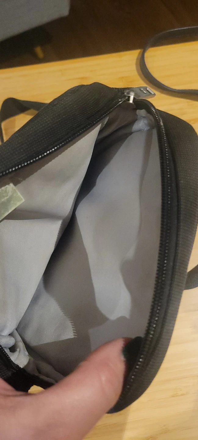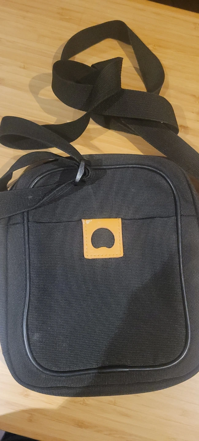 This Delsey crossbody bag is black with a nylon exterior and a grey fabric interior. It features a zippered main compartment and an adjustable strap for comfortable wear. Its compact size makes it handy for everyday essentials.