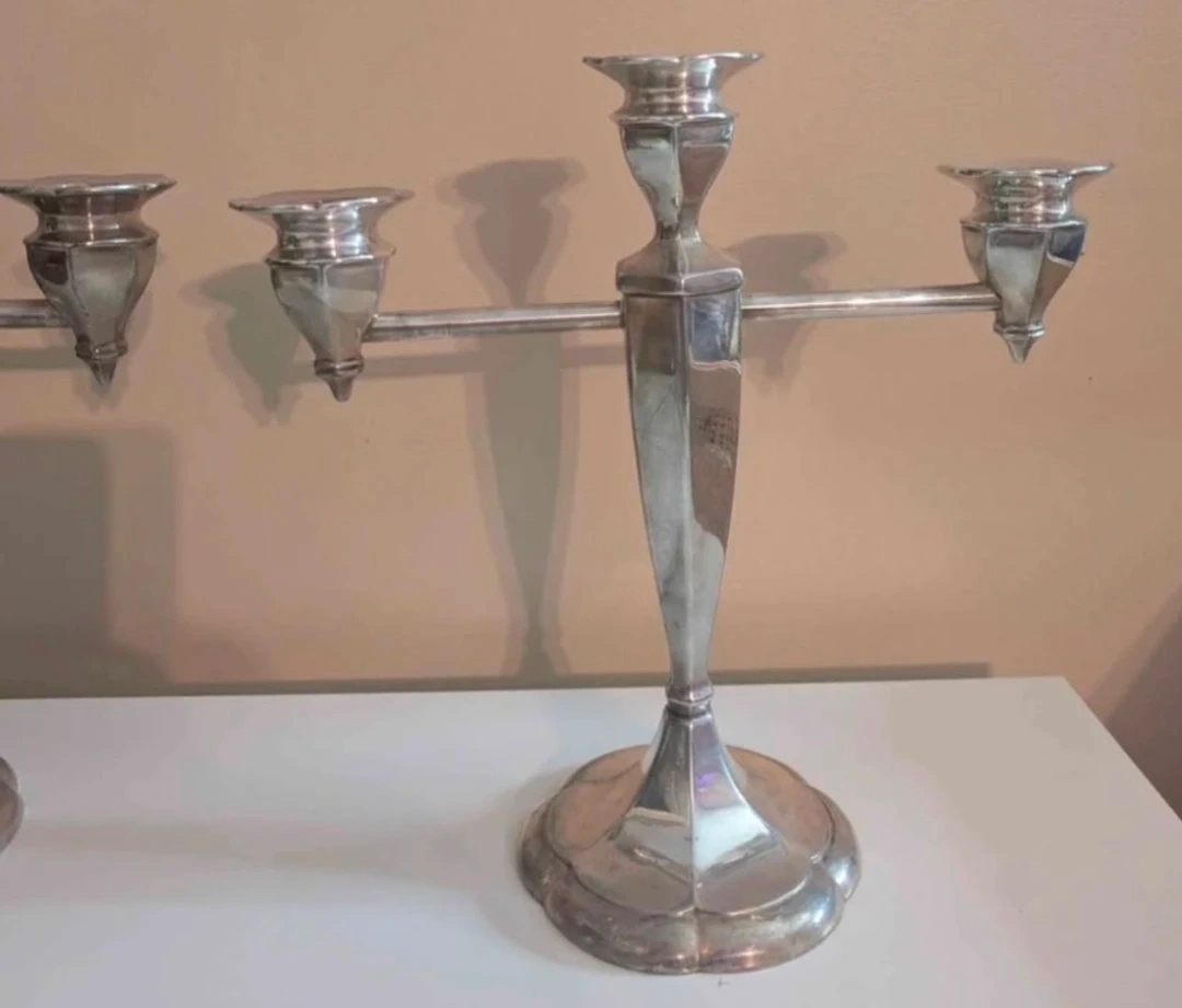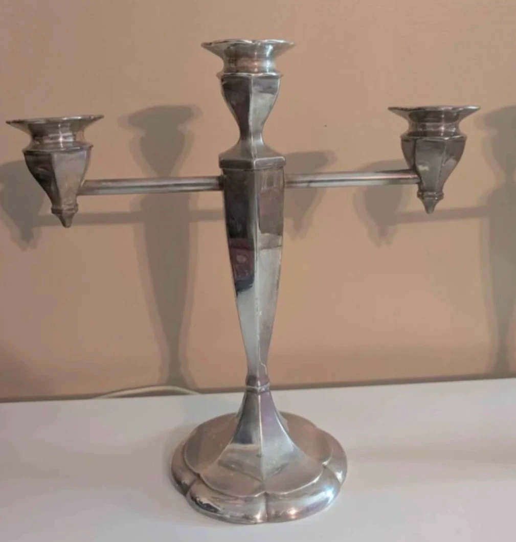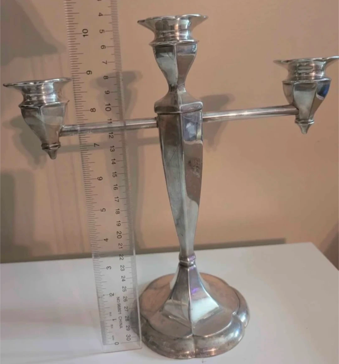 This is a silver-plated three-light candlestick holder. It has a substantial base and a twisted stem. The holder stands about 12 inches tall. It's a beautiful piece for adding ambiance to any room!