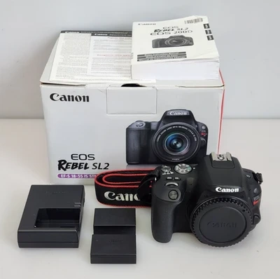 Selling a Canon EOS Rebel SL2 DSLR camera! It comes with the box, charger, lens and instructions. A great camera for beginners or anyone looking for a lightweight and portable DSLR.