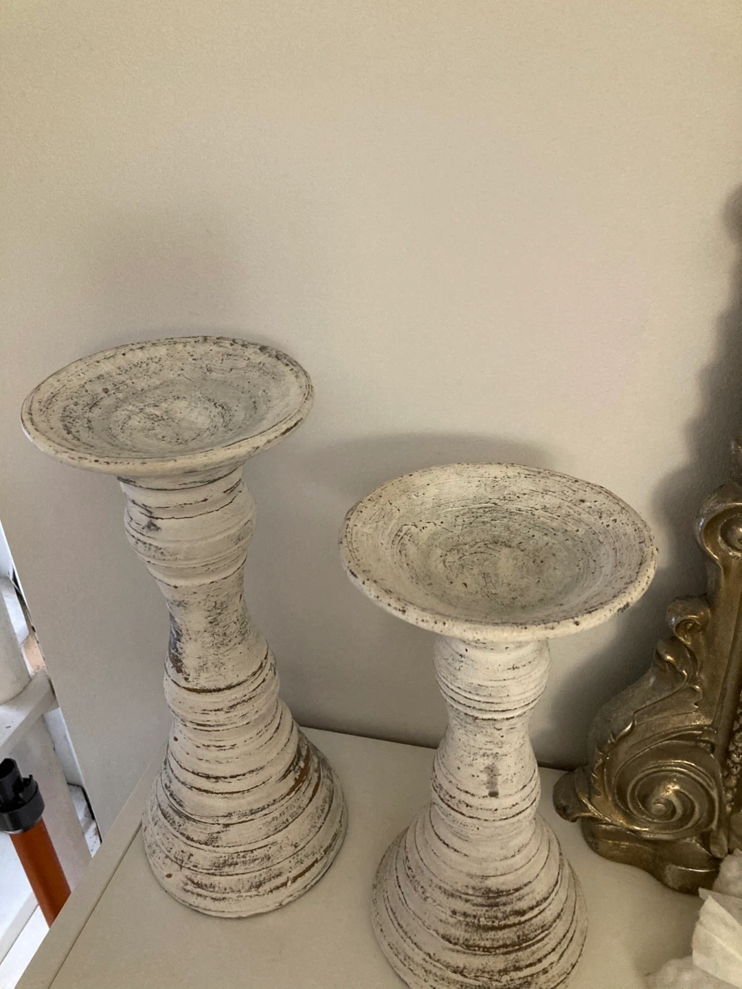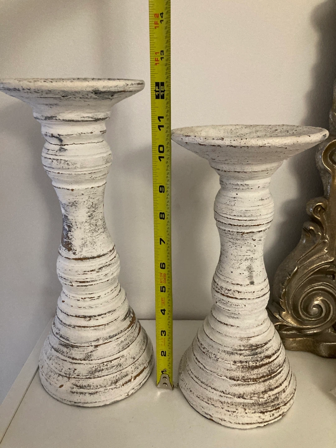 Selling a set of two distressed white candlestick holders. The taller one measures approximately 12.5 inches and the shorter one measures approximately 10.5 inches. They have a rustic, vintage-inspired look with a distressed white finish over a darker base. These holders are perfect for adding a decorative touch to your home.