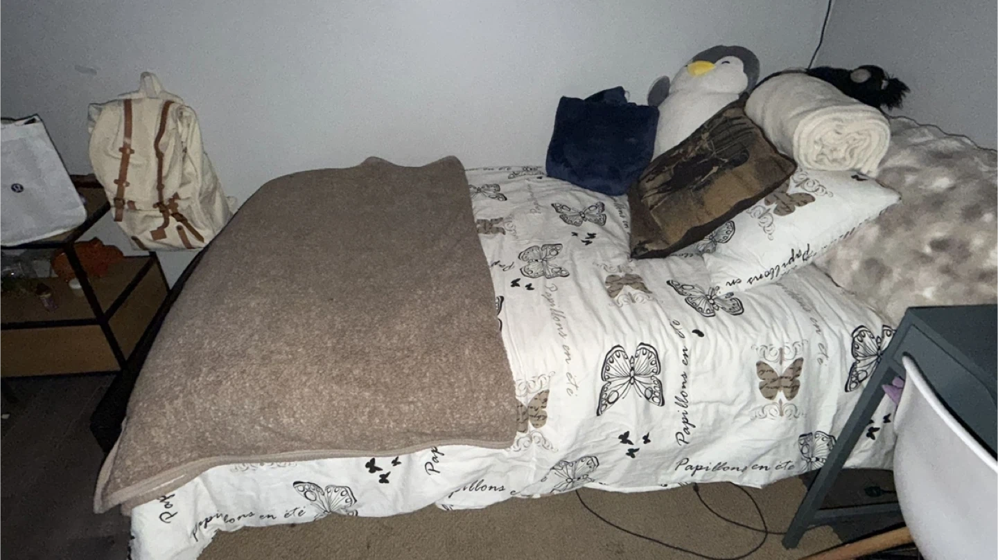 Selling a twin-sized bed frame with a light grey mattress included. The frame is made of black metal and is simple, sturdy, and ready for a new bedroom.