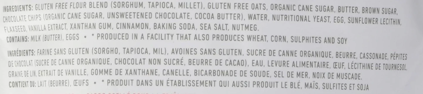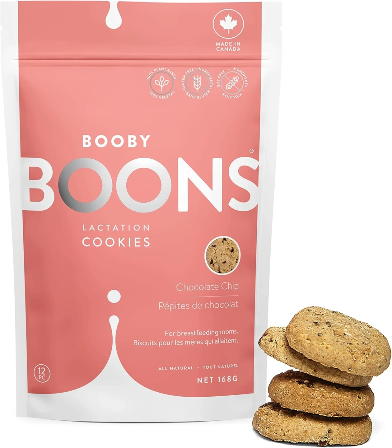 Booby Boons lactation cookies in chocolate chip flavour. Made in Canada with ingredients like oats, flaxseed, and chocolate chips. These cookies are 100% plant-based, gluten-free, and soy-free. Suitable for breastfeeding moms.