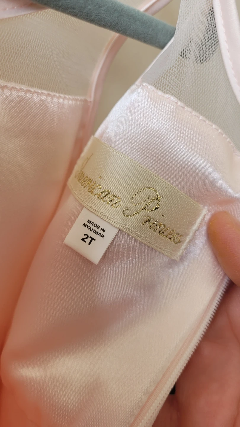 This beautiful pink dress from American Princess features a pearl-adorned bodice and a full tulle skirt, perfect for special occasions. It's a size 2T with a shimmering finish. This dress is ideal for parties or family gatherings!