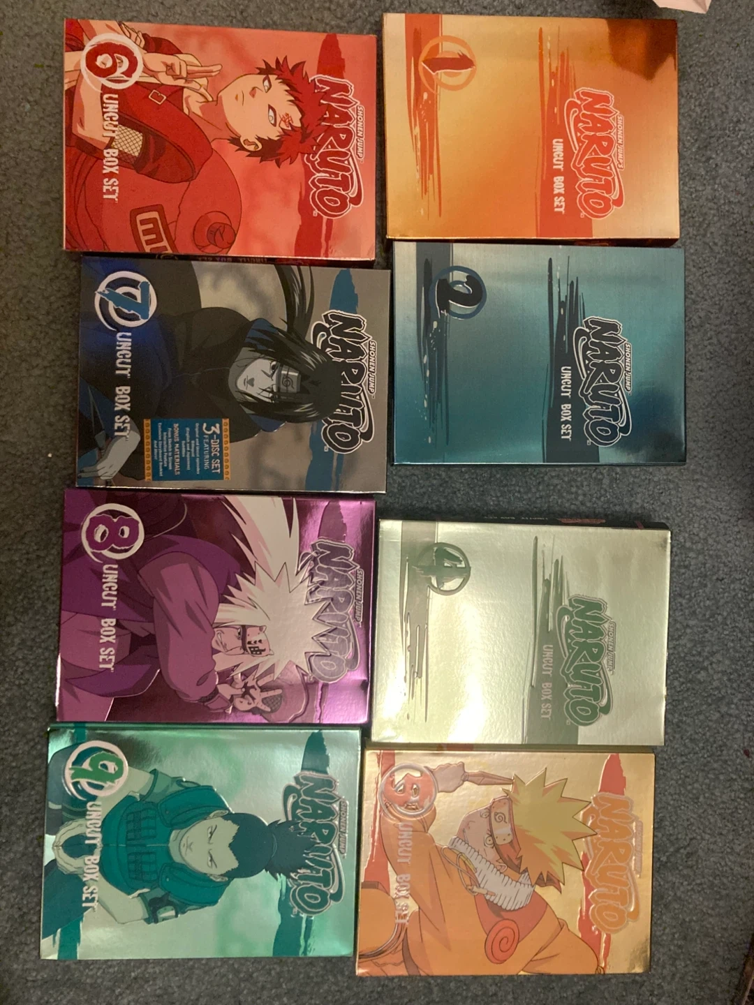 This is a collection of Naruto Uncut Box Sets. Only missing #3. It features multiple volumes of the popular anime series. Each box set is uncut and includes bonus materials.