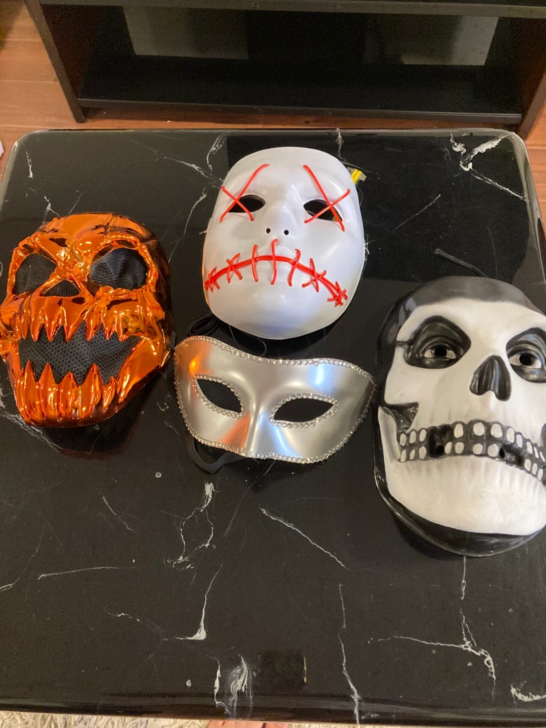 Get ready for Halloween with this set of four fun masks. Includes a spooky pumpkin mask, a classic skull mask, a white glow-in-the-dark light up mask with red stitching LED purge mask, and a silver masquerade mask. Great for parties and trick-or-treating!