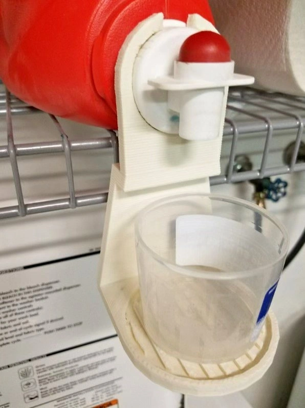 Holds your measuring cup under the spout while you dispense detergent and collects any drips. This is 3D printed and can be made in the color of your choice.