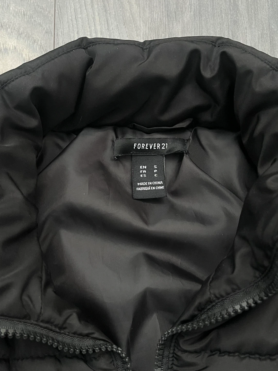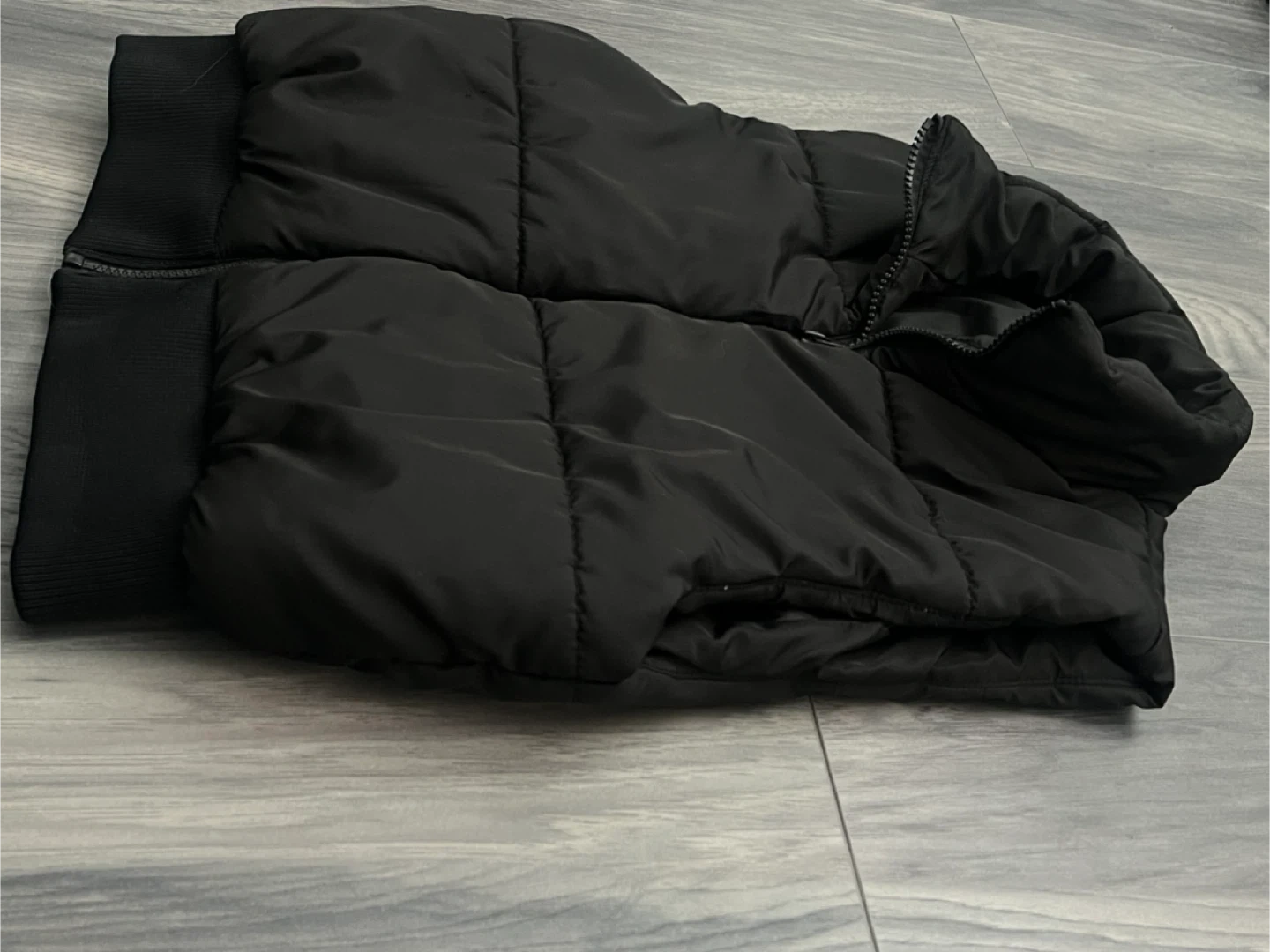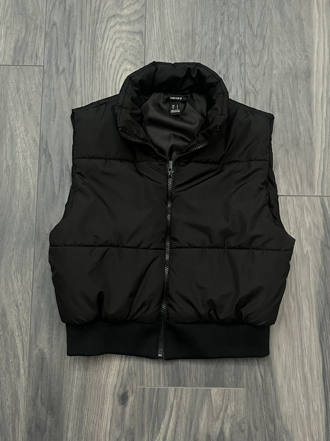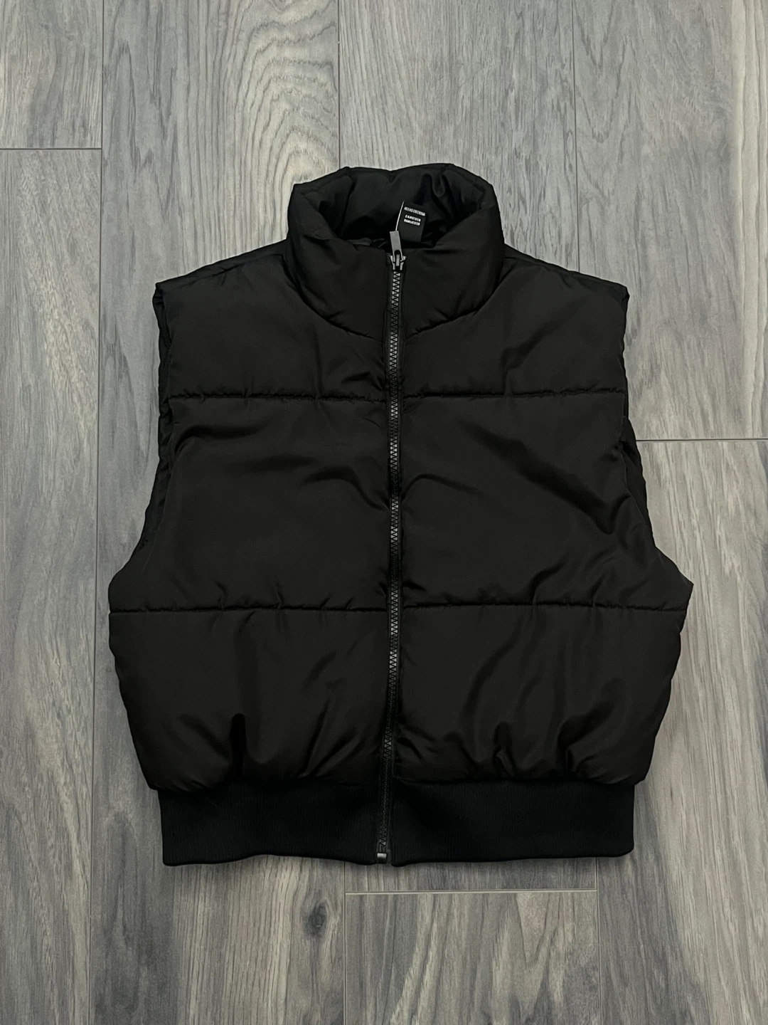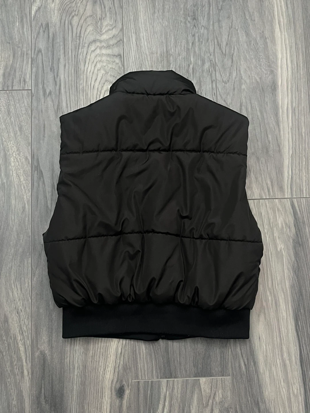 Black puffer zip up vest. Good for spring and fall. Cinched at the waist. Simple and comfortable.