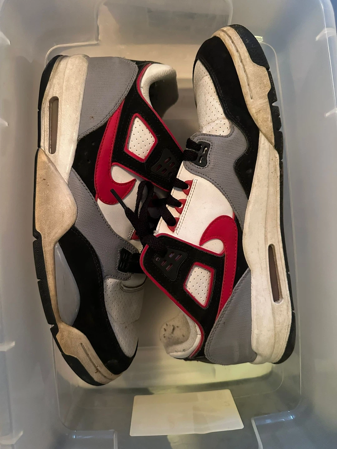 Nike Air Cross Trainer 3 Low sneakers in a white, black, grey, and red colourway. These shoes feature a durable design with air cushioning. Suitable for athletic activities.