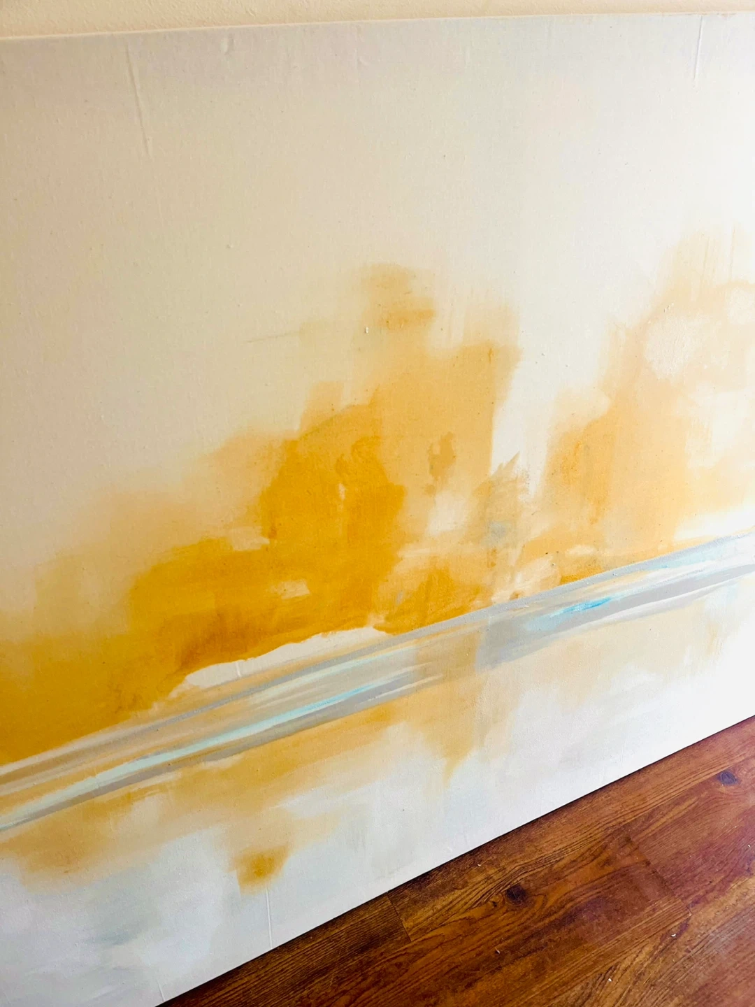 This is a real painting, a Large abstract painting with warm yellow, golds , and grey-blue tones. This artwork features a minimalist landscape design on canvas. It's a unique piece that would complement a modern decor.