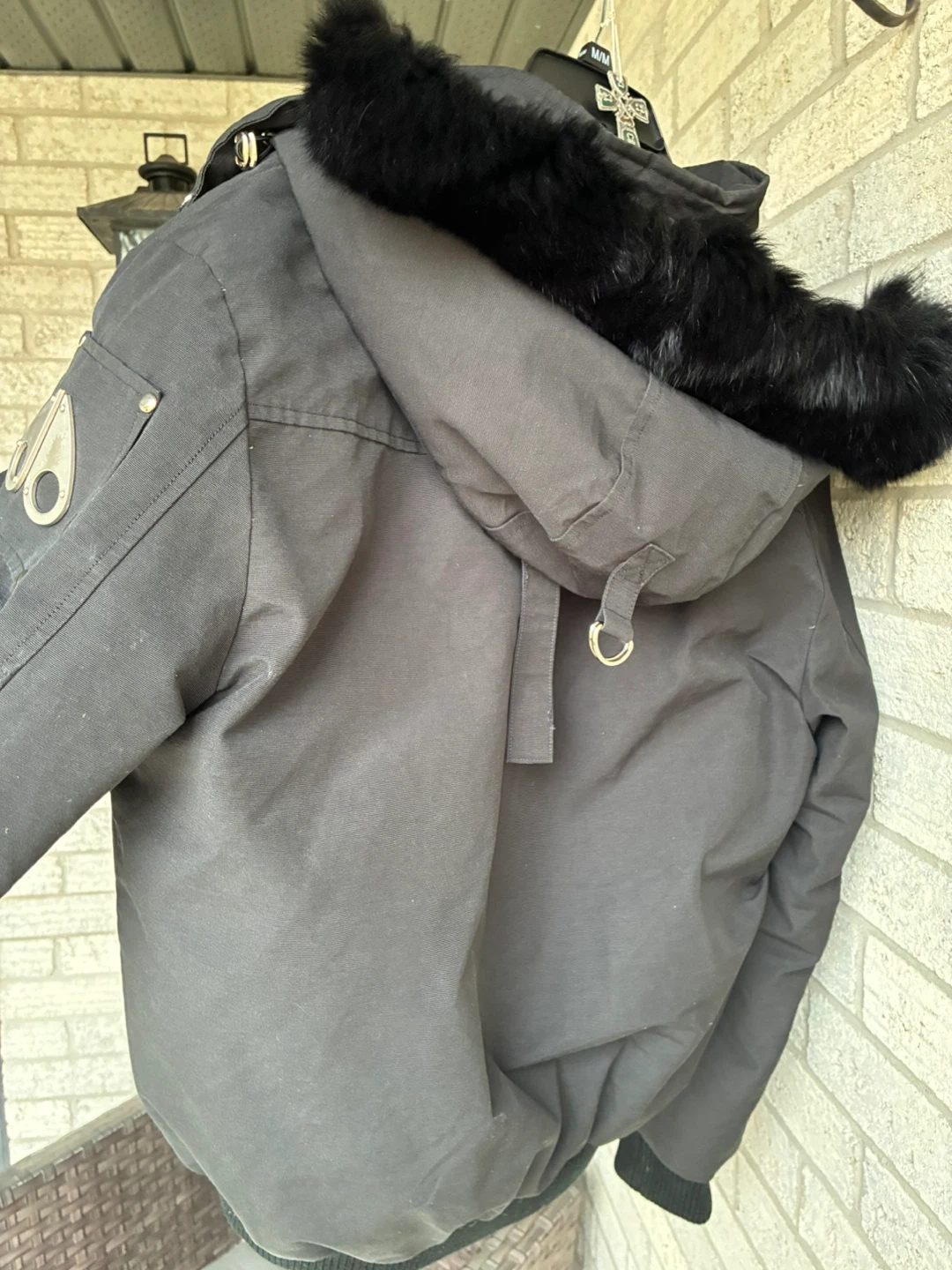 Moose Knuckles down filled parka jacket, made in Canada with Canadian down. Features a black outer shell and a black fur-lined hood. Size L/G.