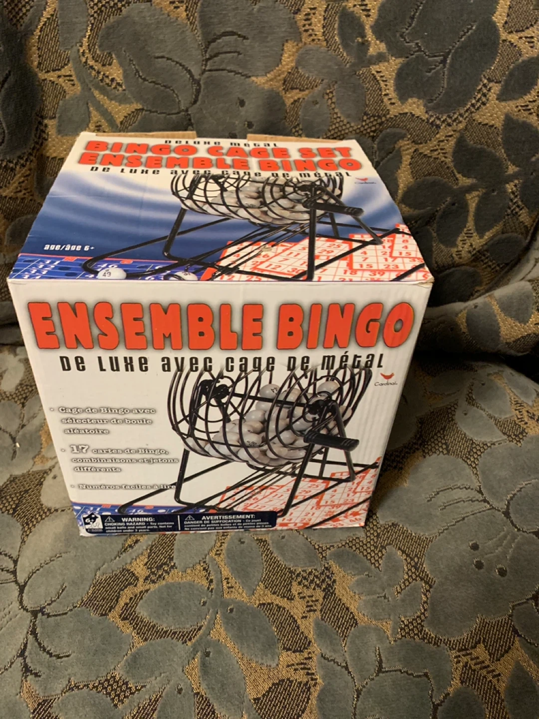 This is a deluxe bingo cage set with a metal cage. It includes 17 bingo cards with different combinations and tokens. The numbers are easy to read. Suitable for ages 6 and up.