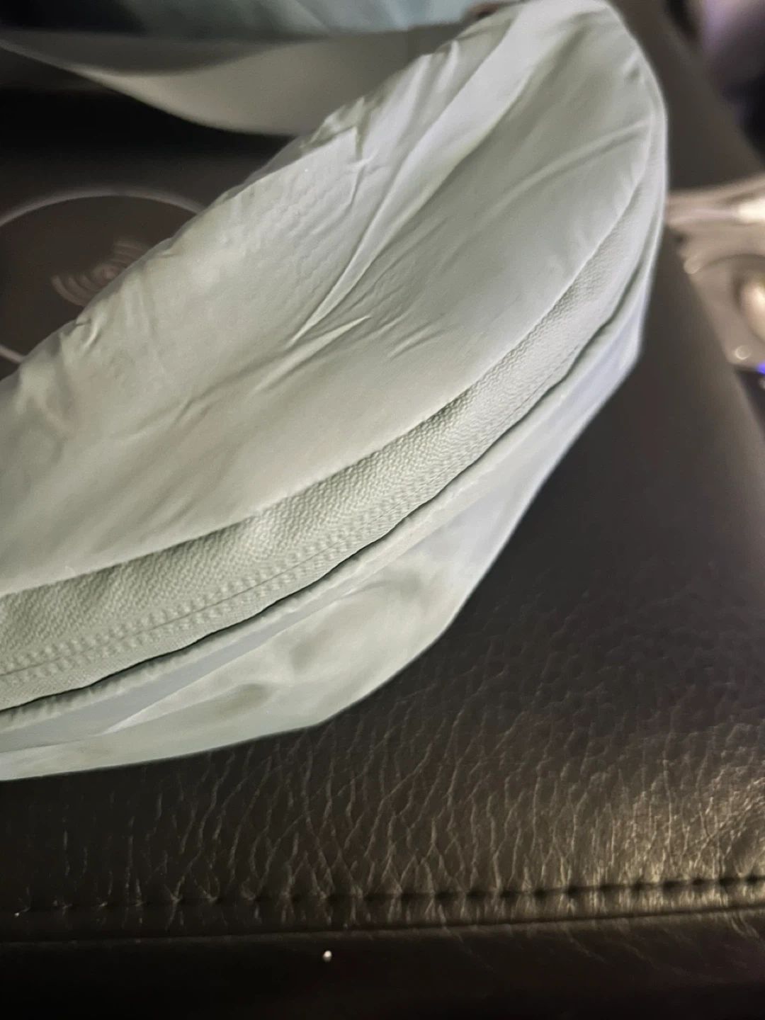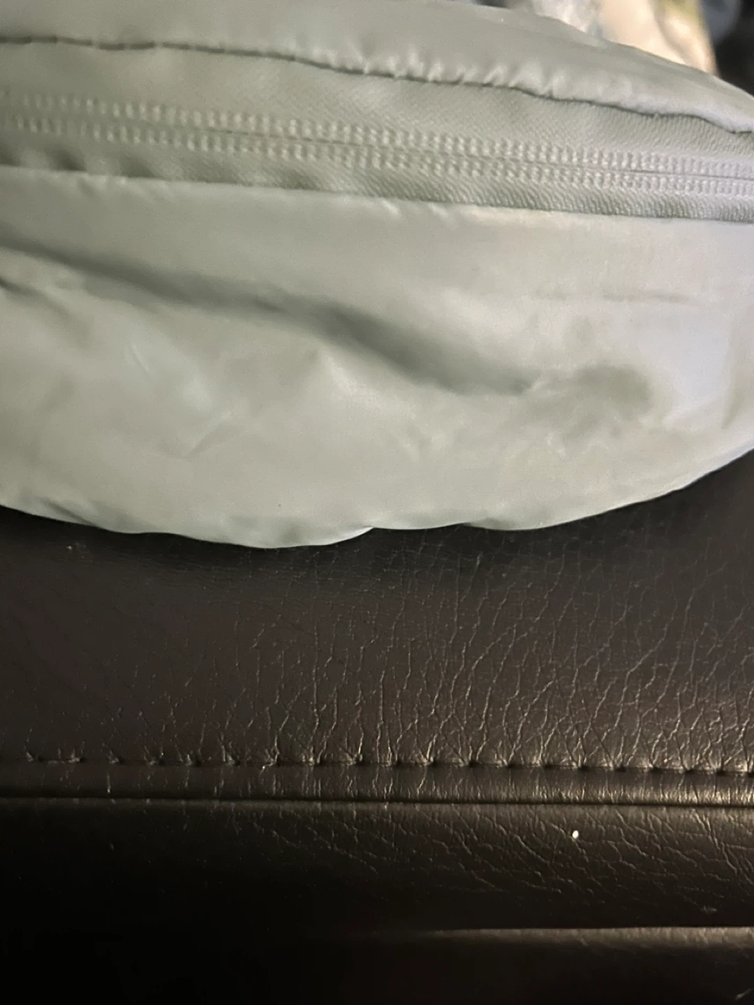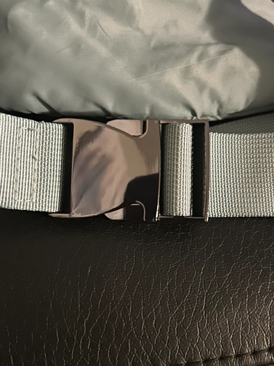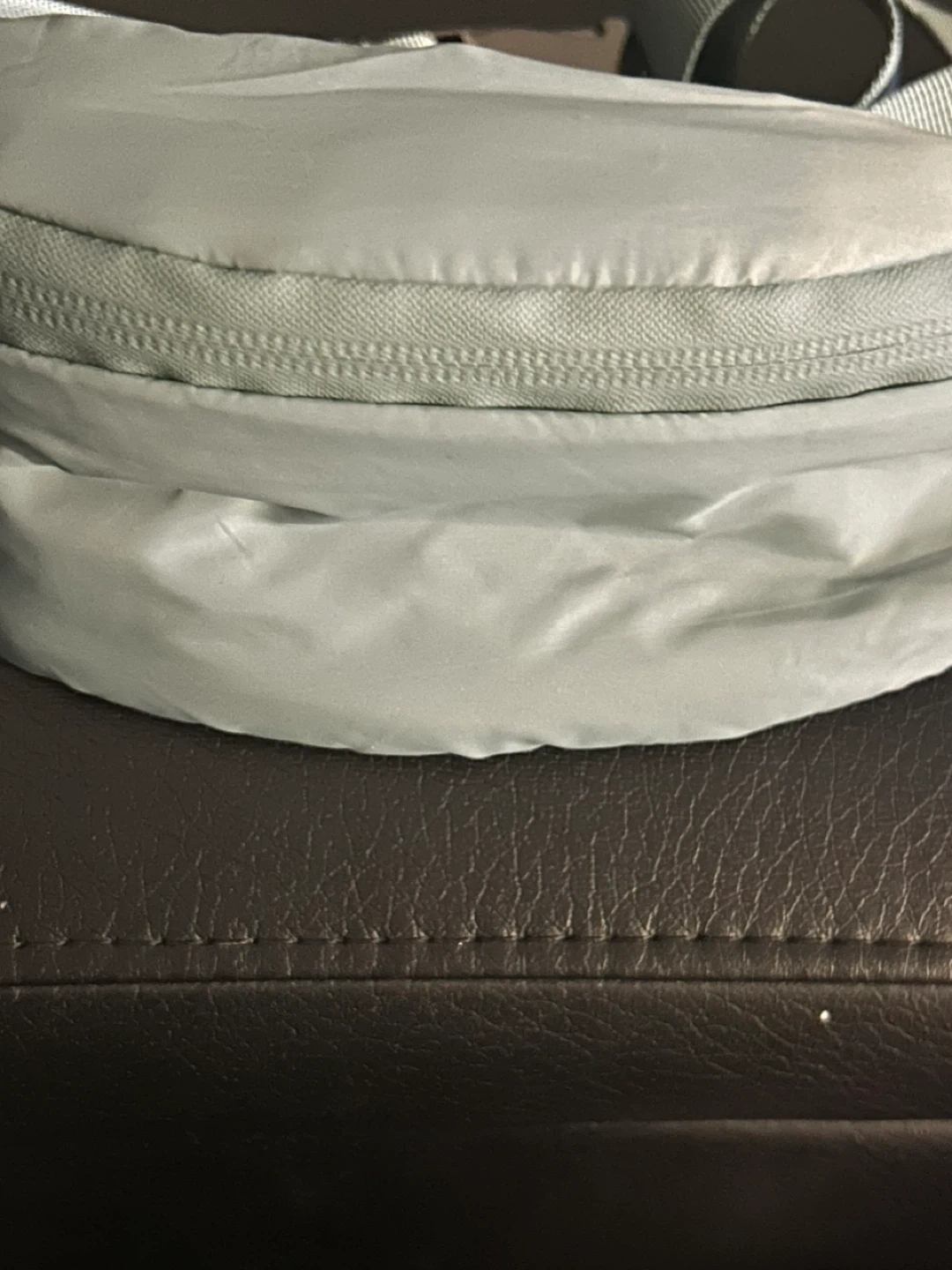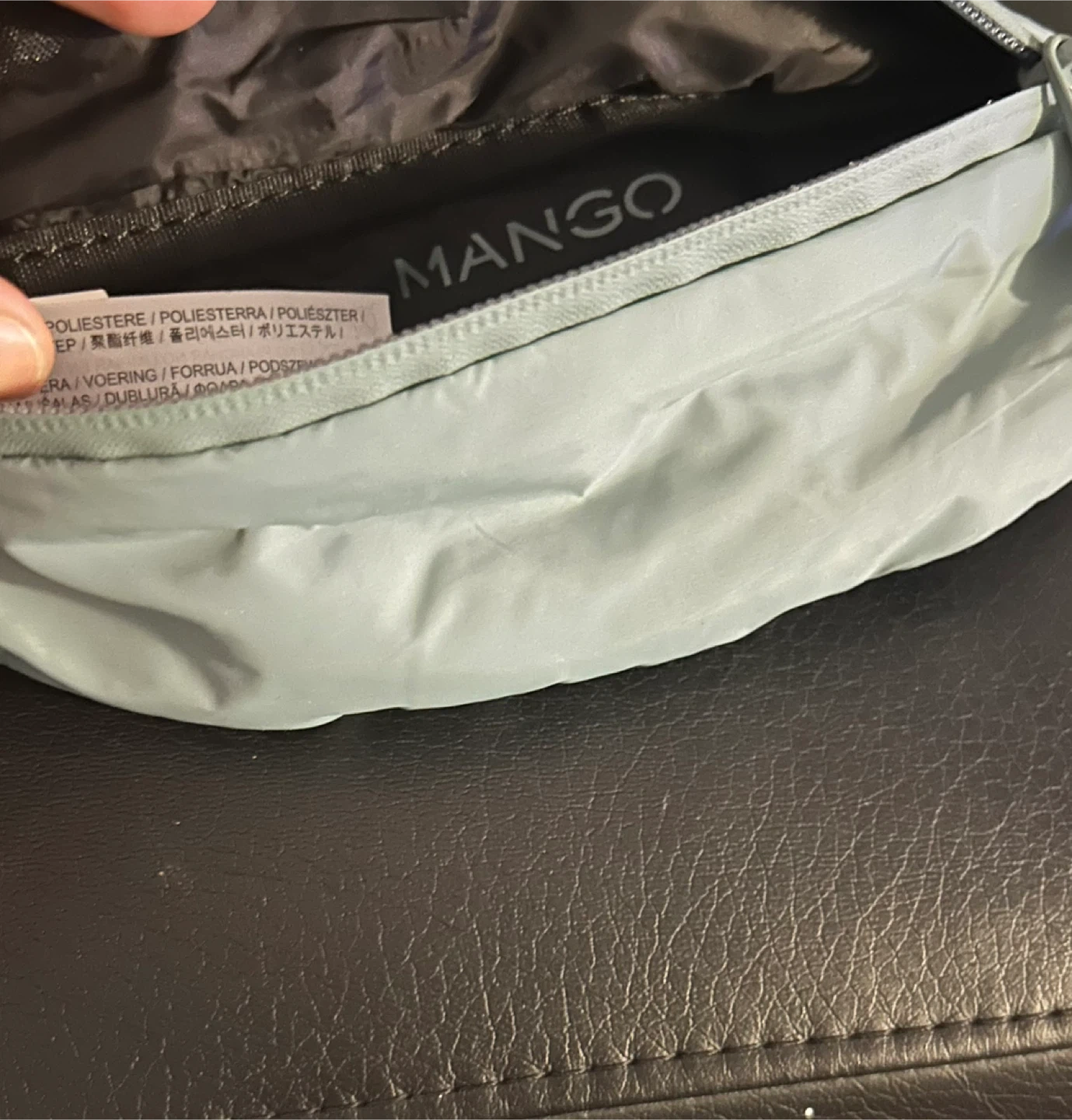 This is a MANGO fanny pack in a light blue colour. It's made of polyester material. It has an adjustable strap with a buckle closure.