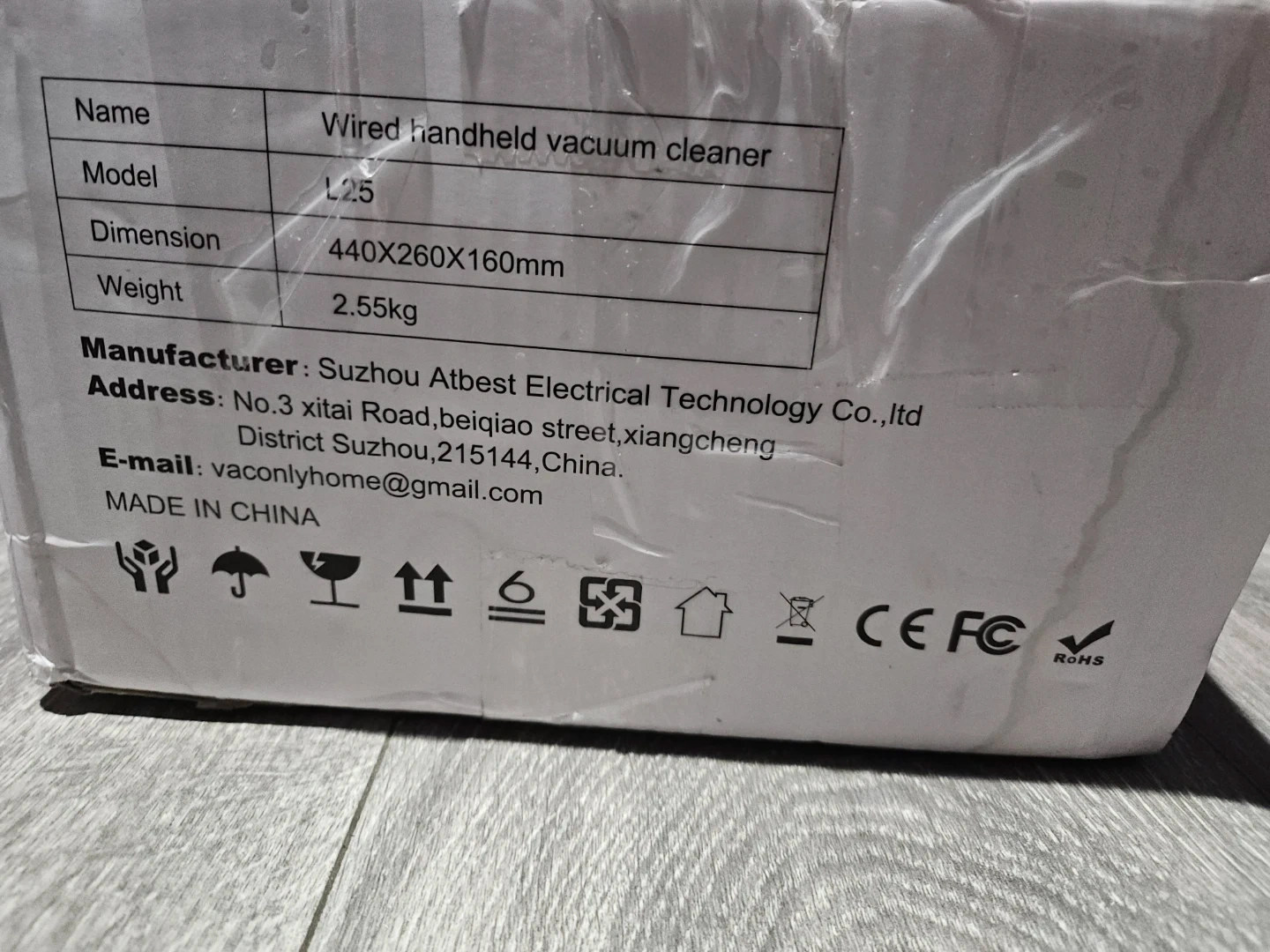 This is a wired handheld vacuum cleaner, model L25. It has dimensions of 440x260x160mm and weighs 2.55kg. The item includes the vacuum unit, various attachments, and the original box. It's perfect for quick cleanups around the house!