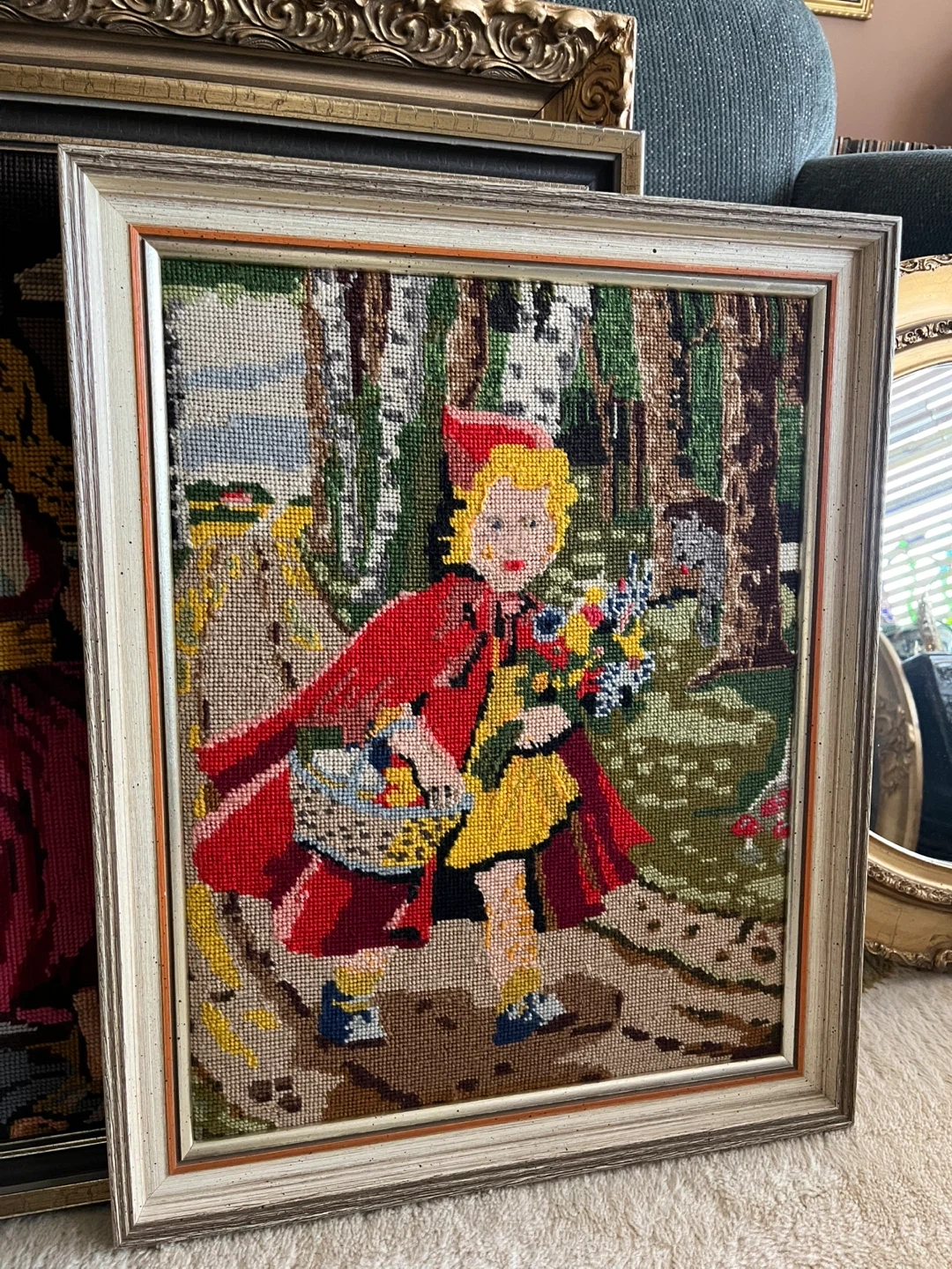 Two charming framed needlepoint art pieces. One depicts Cinderella with birds, and the other shows Little Red Riding Hood in the forest. These artworks add a touch of vintage storybook charm to any room. Perfect for a nursery or a whimsical living space!
