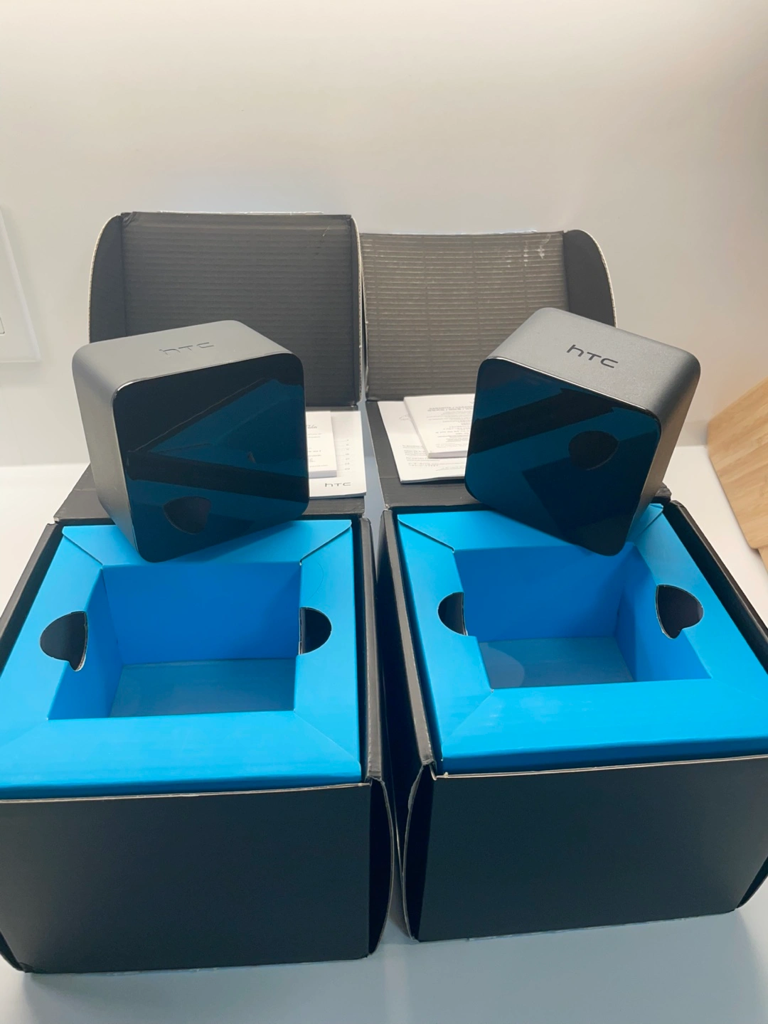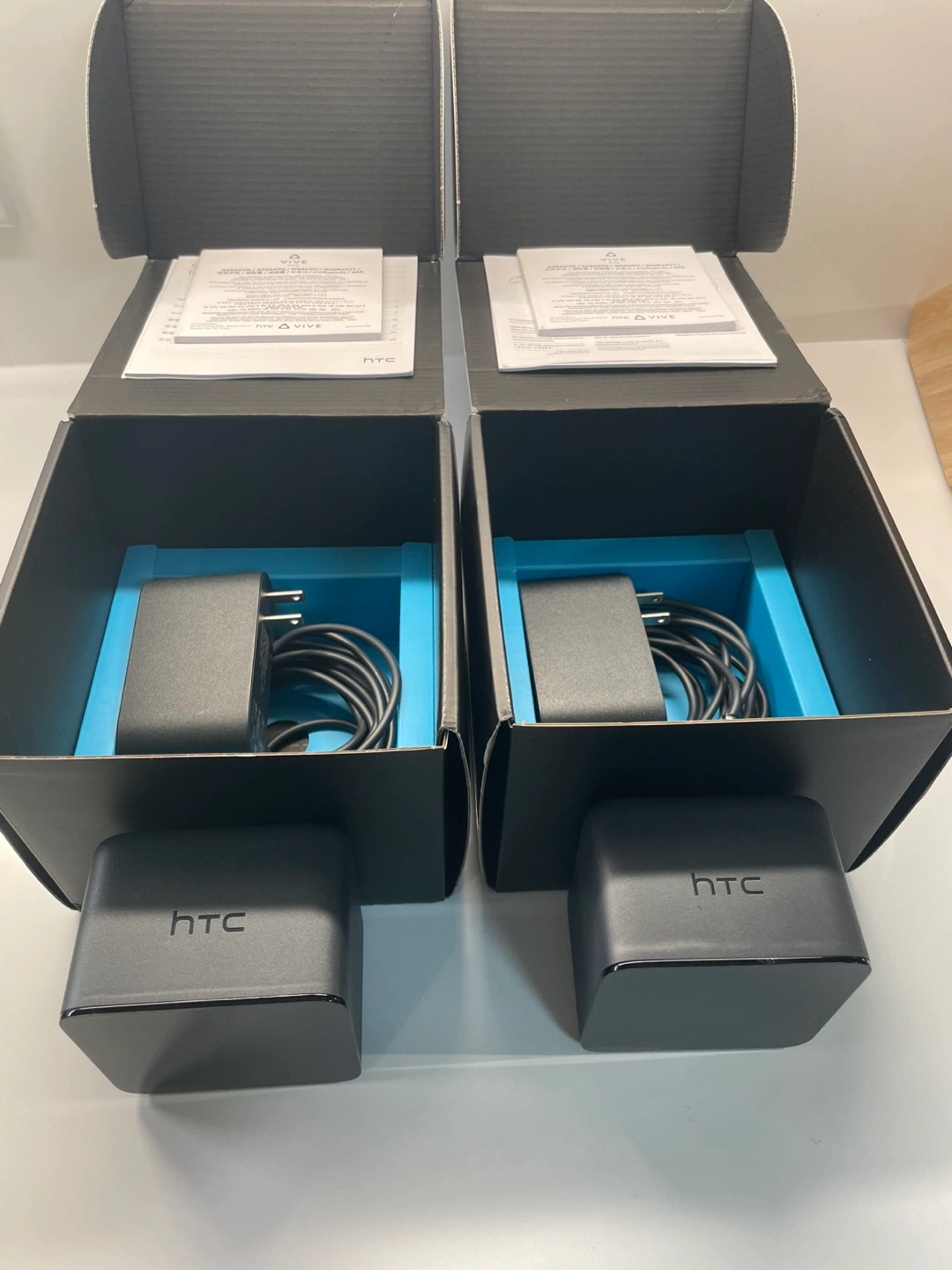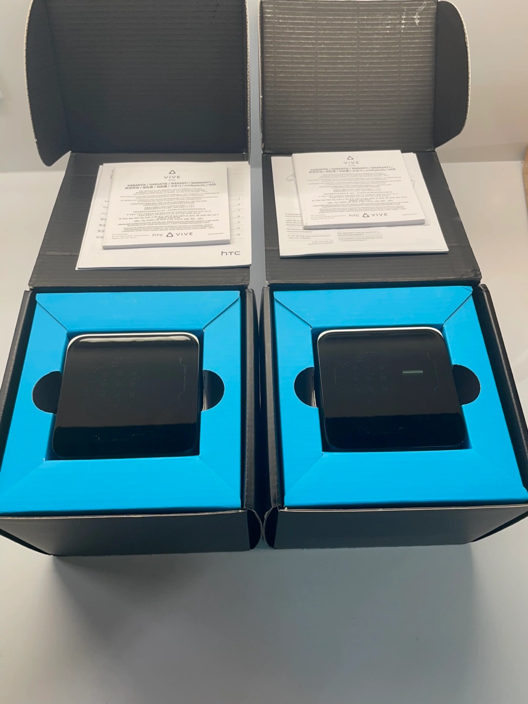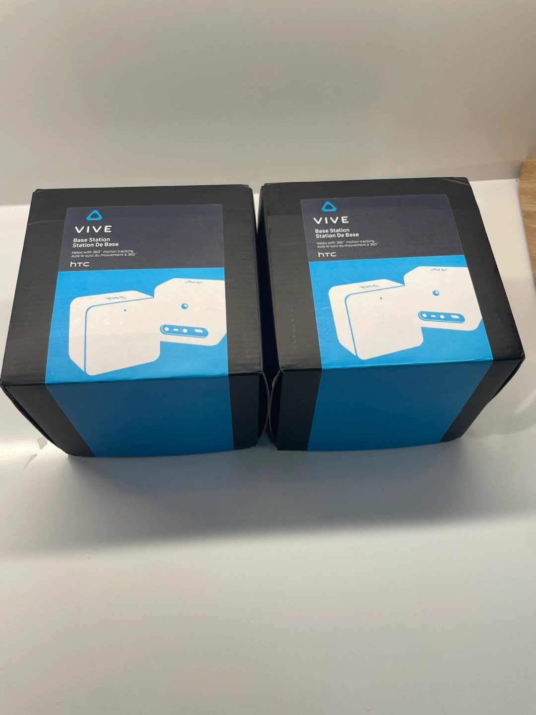Two brand new HTC Vive Base Stations. Includes all original packaging and accessories. 360 degree room-scale tracking. Perfect for VR setup. Accidentally ordered the wrong base stations. Never been used.