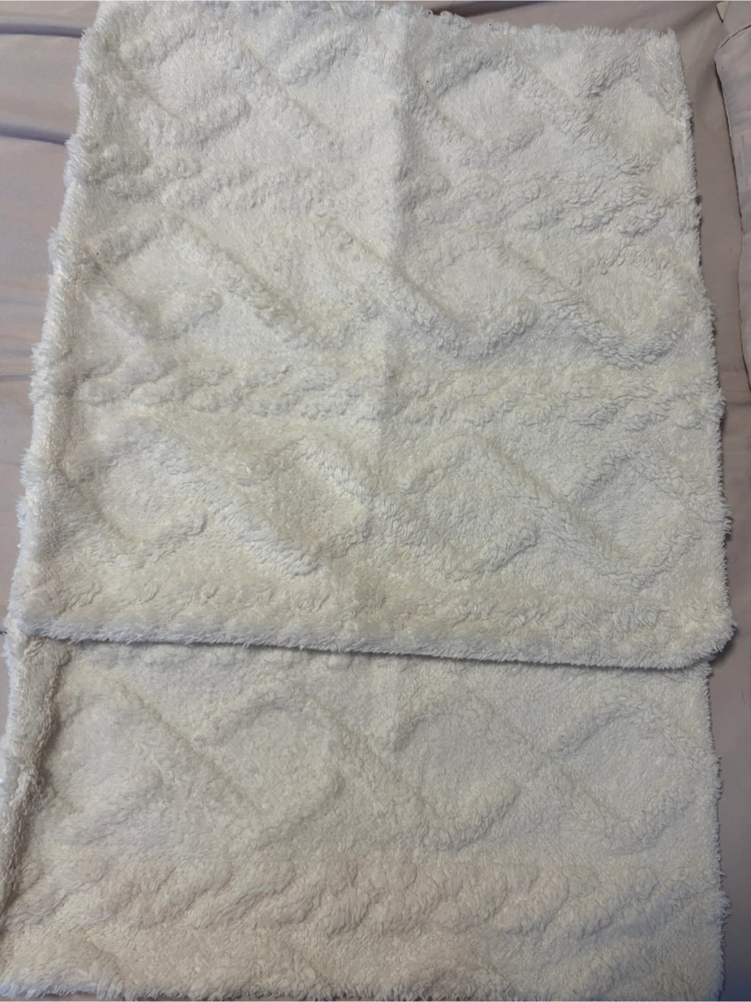 This is a super soft, white fur pillow covers. It features a diamond pattern throughout the material.