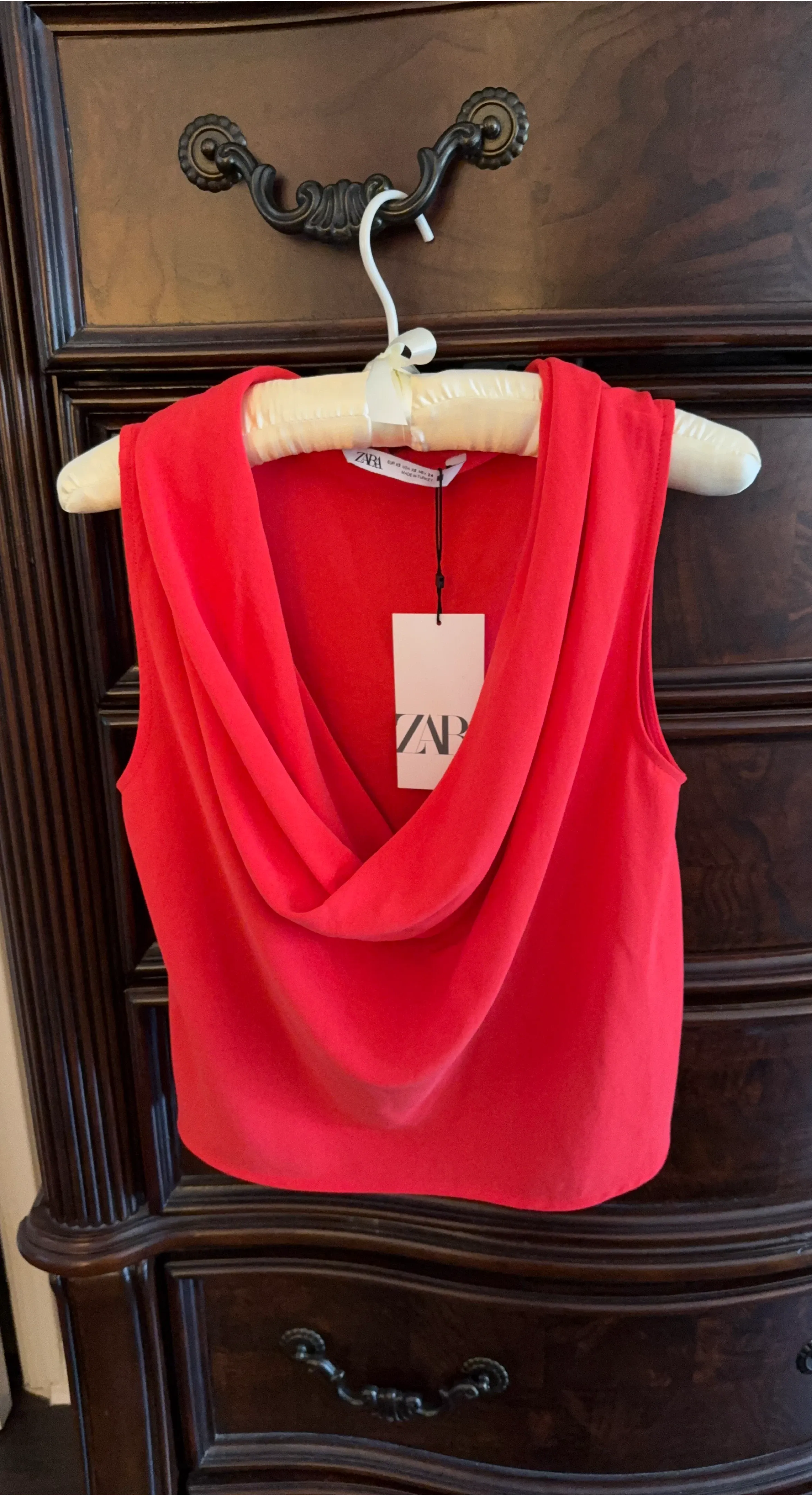 This is a Zara red sleeveless top with a stylish cowl neck. It's a size XS. It's perfect for dressing up or down!