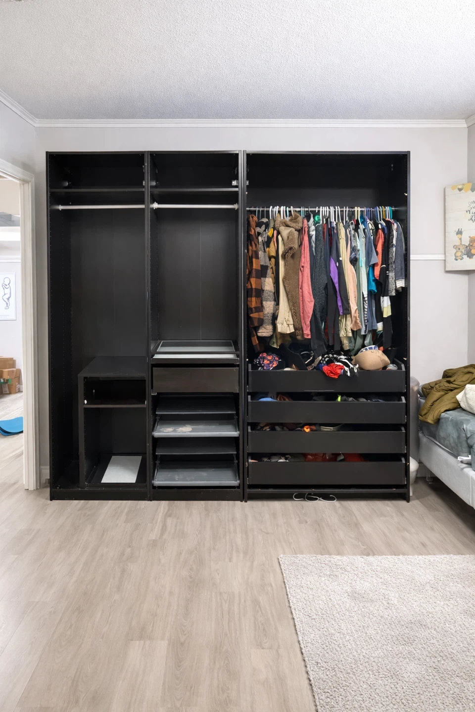 Black Wardrobe System with Hanging Rods and Drawers