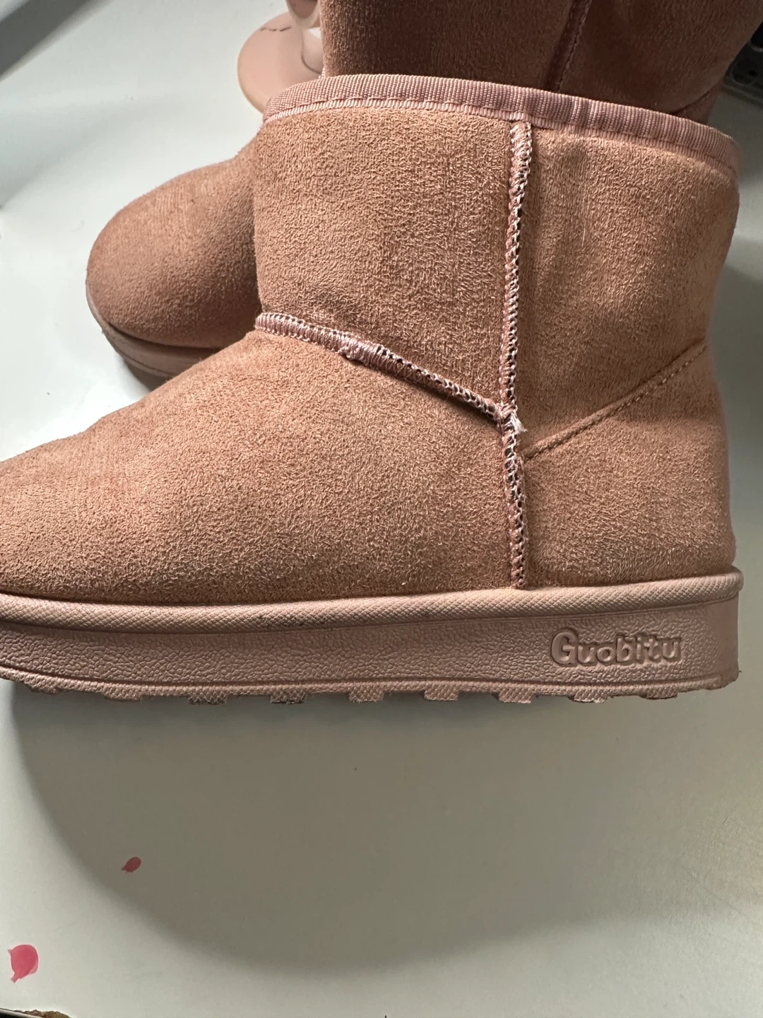 These Guabitu boots are a lovely soft pink color. They feature a cozy faux fur lining for extra warmth. The exterior material looks like suede. Perfect for keeping your feet toasty during colder weather!