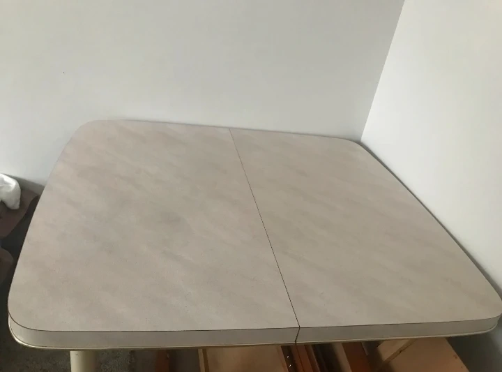 A square-top vintage table with white legs. The table surface has a neutral, speckled pattern. It's a great size for a small kitchen or dining area. Perfect for everyday meals!