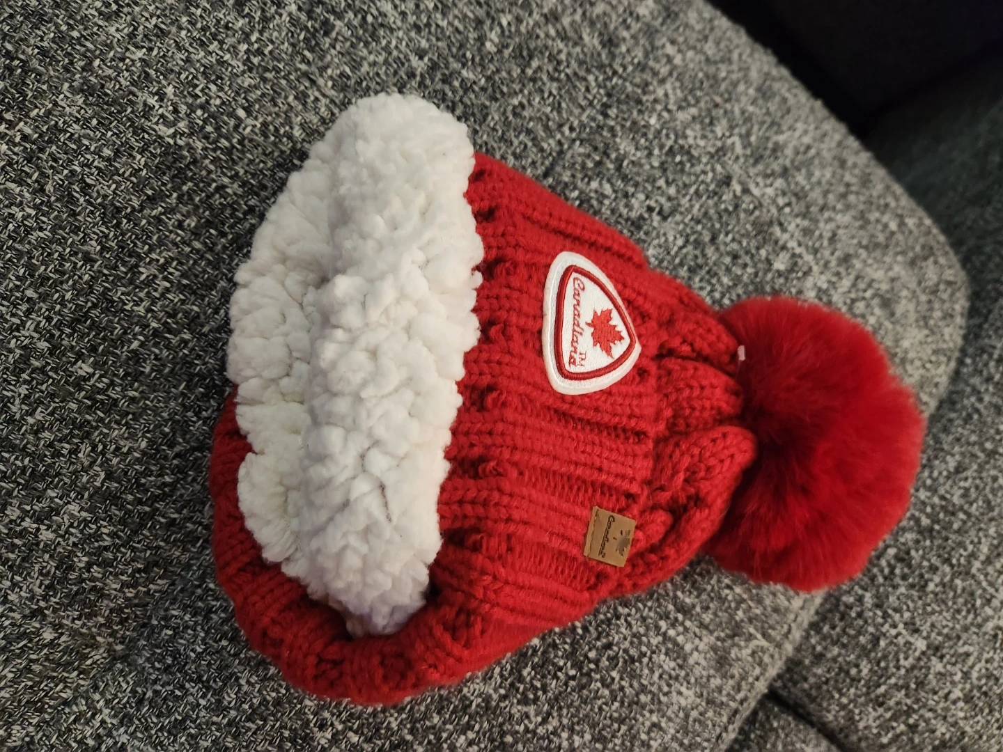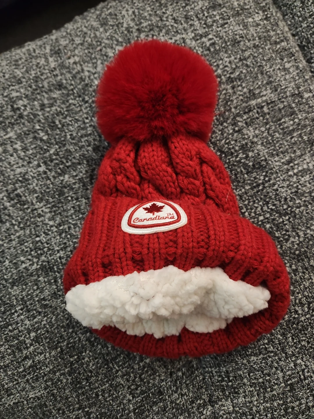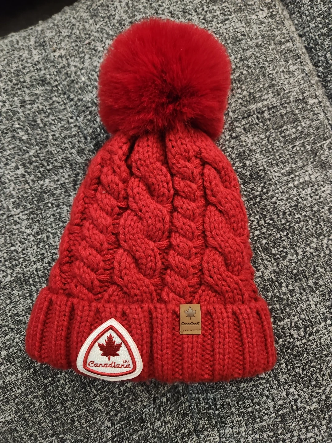 This Canadiana toque is bright red with a cable knit pattern and a fluffy pom pom. It features a maple leaf patch and a small leather tag with the brand name. It's made of a warm, knitted material.