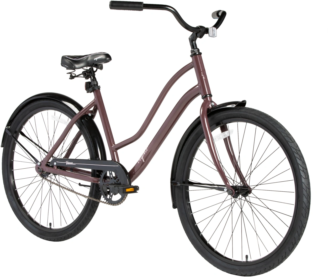 Brand New still in the box. This is a women's cruiser single speed bicycle in a burgundy colour with black fenders, handlebars, and seat. It has 26" wheels with black tires.