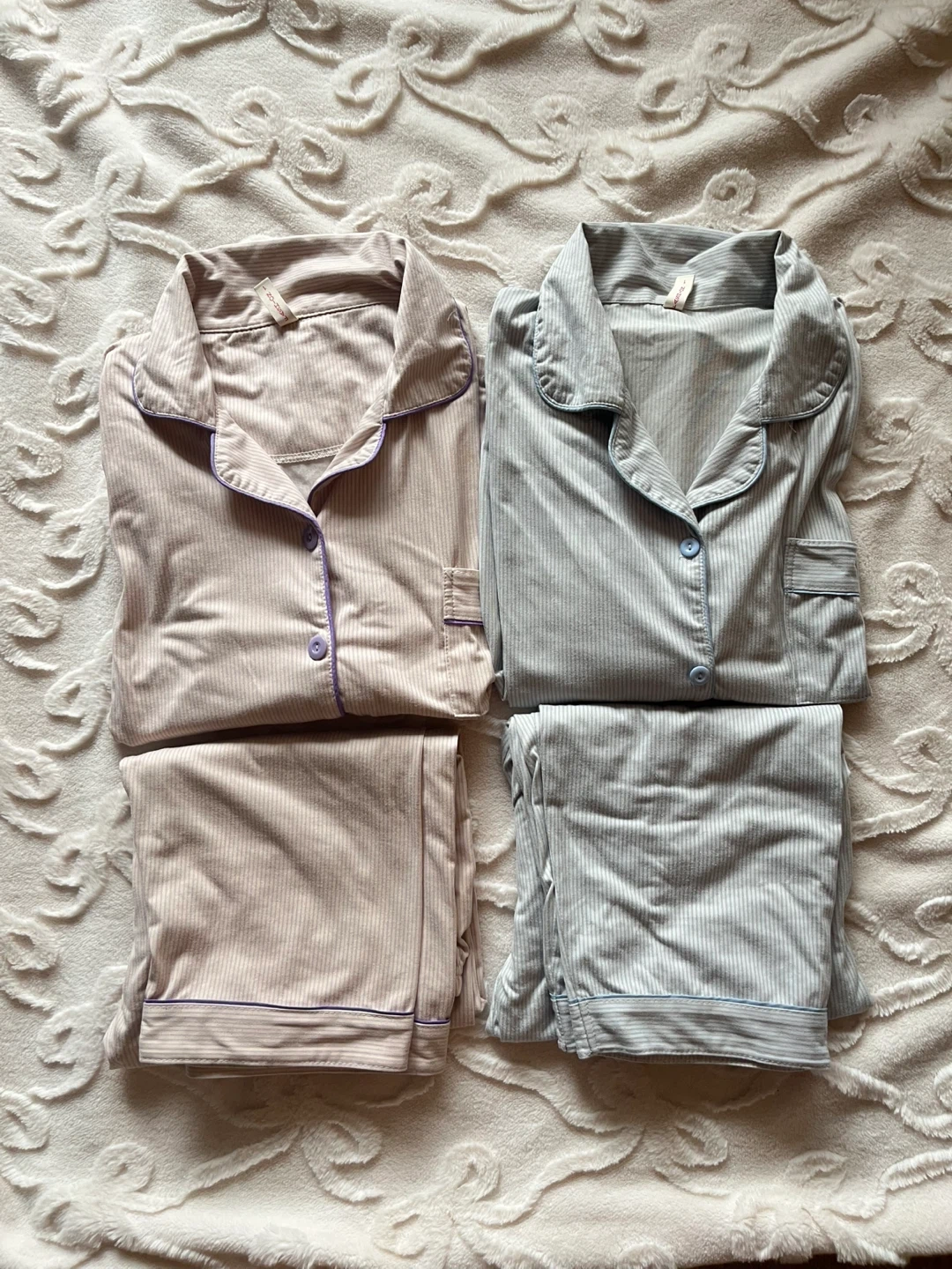 Two comfy pajama sets up for grabs! One is a soft pillow pink with purple trim, and the other is a light blue with matching trim. Both are in great condition.