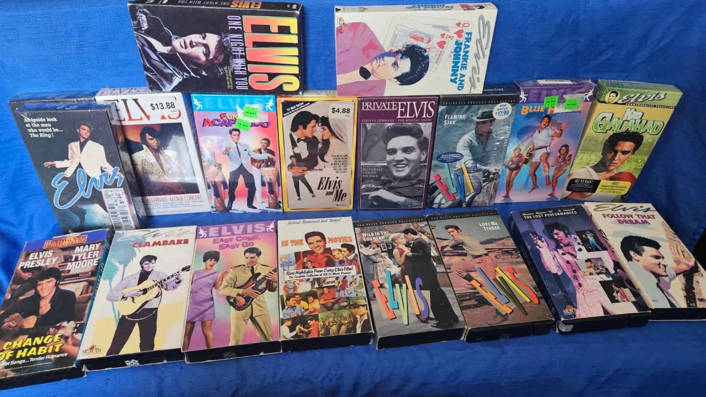 This is a collection of various Elvis Presley VHS tapes. 19 items total.