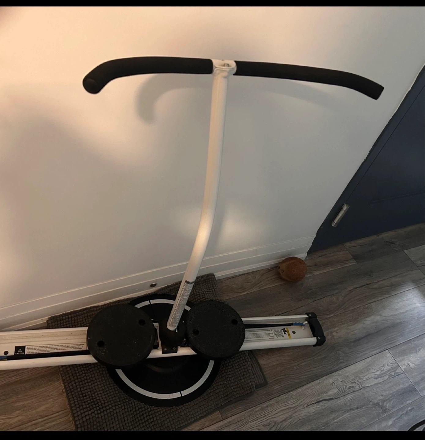 This is a fitness roller ski machine for indoor training. It's white and black with padded handlebars. This device is designed for simulating cross-country skiing movements.