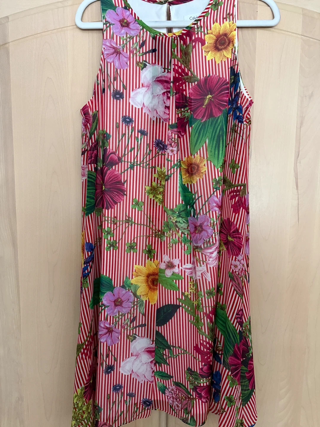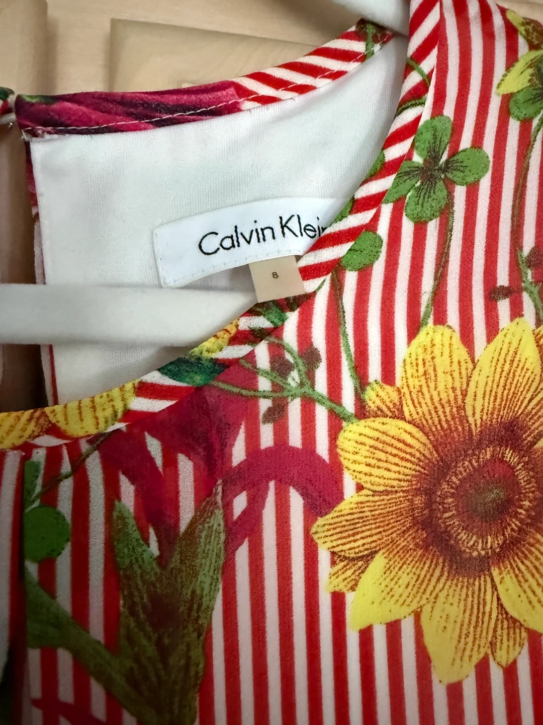 This Calvin Klein sleeveless dress features a vibrant floral print on a red and white striped background. It's a size 8. This dress is perfect for warmer weather occasions!