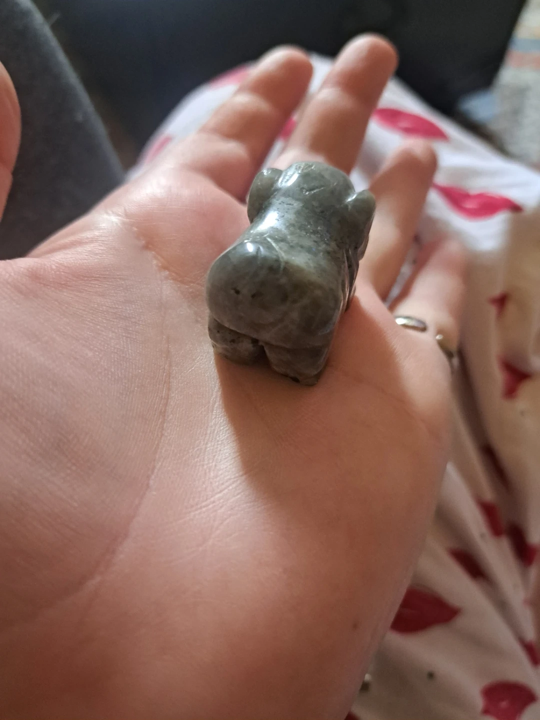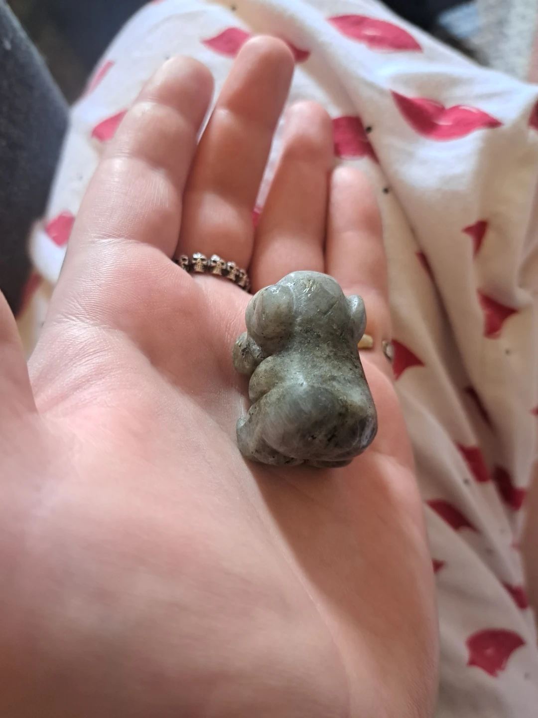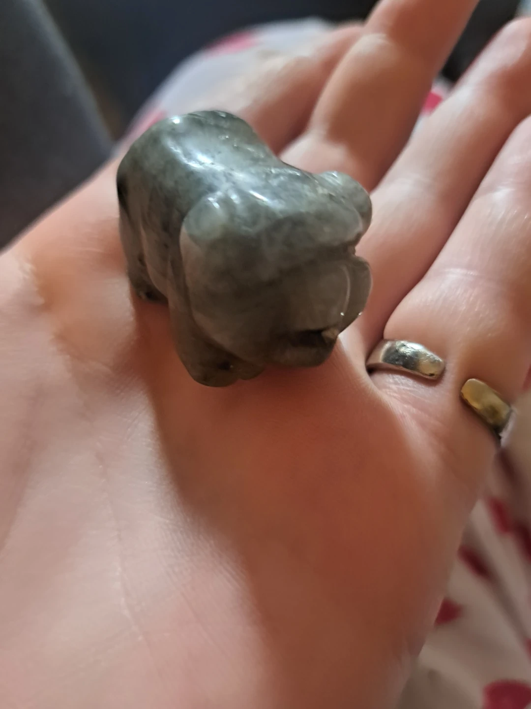 This is a small carved figurine of an animal, made from labradorite stone. It's grey with natural mineral inclusions. It's the perfect size for a desk or shelf accent. It might appeal to collectors of stone carvings or unique decorative pieces.