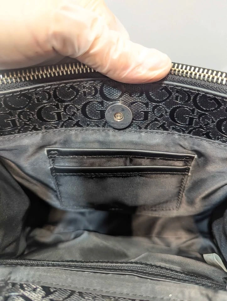 The wristlet metal GUESS logo has been painted black due to the dezincification process which removes the silver and the copper remains.