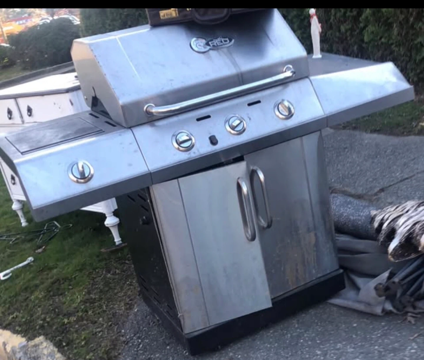 This RED propane grill is ready for your backyard BBQs. It features a stainless steel lid and front panel. Perfect for cooking