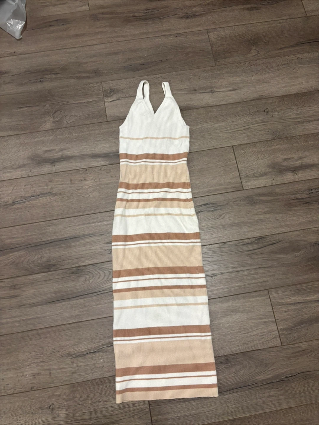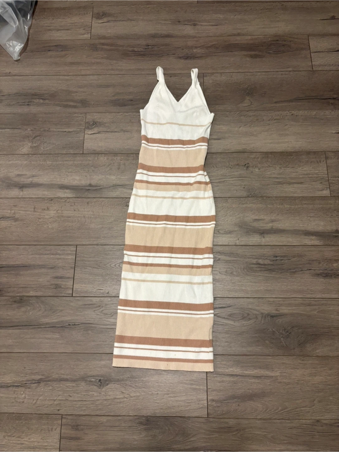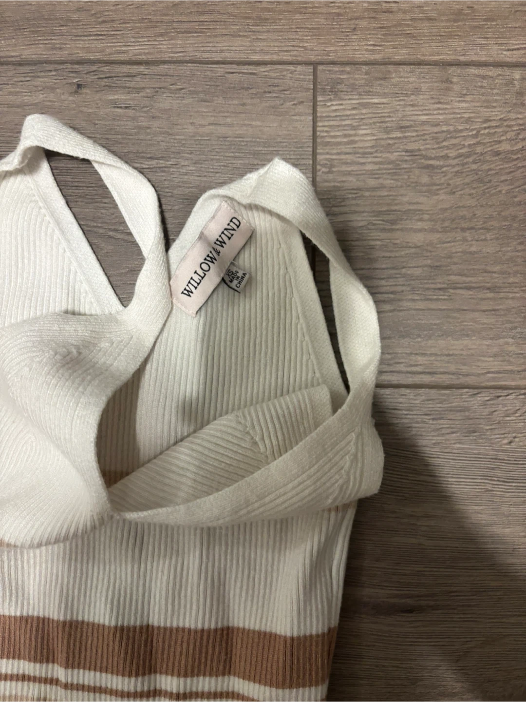 Here's a cute Willow & Wind striped dress! It's a size small and features a mix of white and tan stripes. Perfect for a casual day out or a summer evening. Very stretchy and comfortable fit, about past knee length.