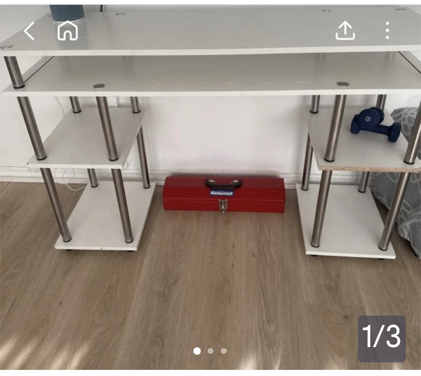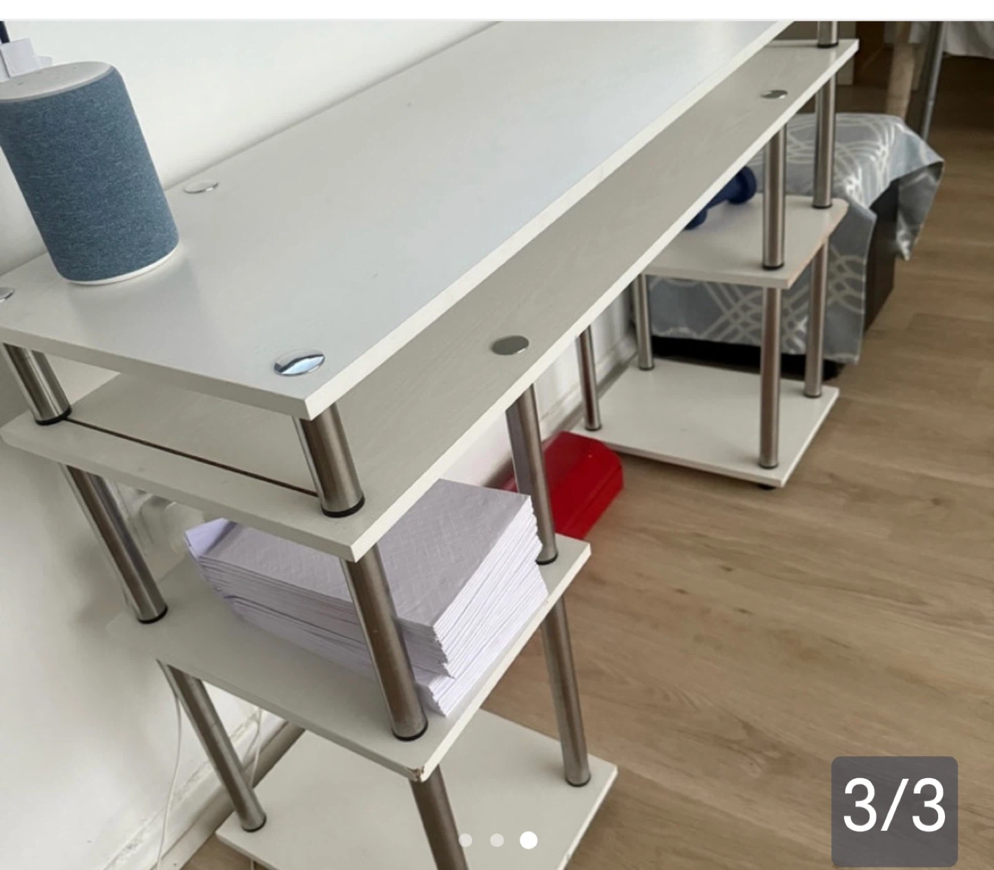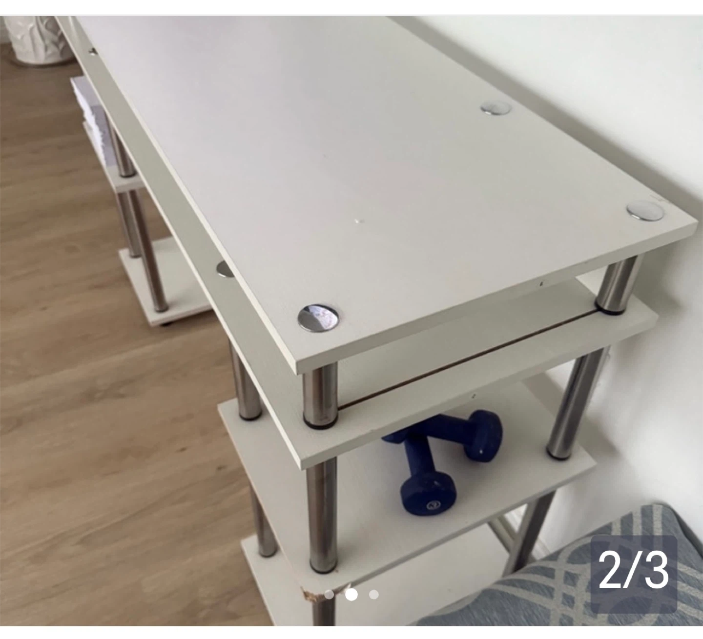Here's a handy white shelf unit with three tiers! It's perfect for organizing books, decor, or anything else you need to keep tidy. The shelves are white and supported by metal poles.