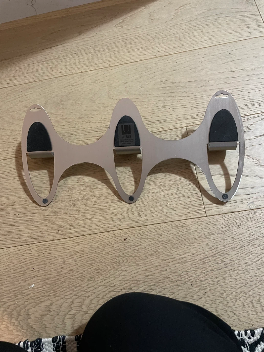 This Umbra wall rack offers three sturdy hooks for hanging coats, bags, or other accessories. It's made from metal with a brushed finish and includes black felt pads on each hook to protect your items. Easy to install, it's great for entryways or closets!
