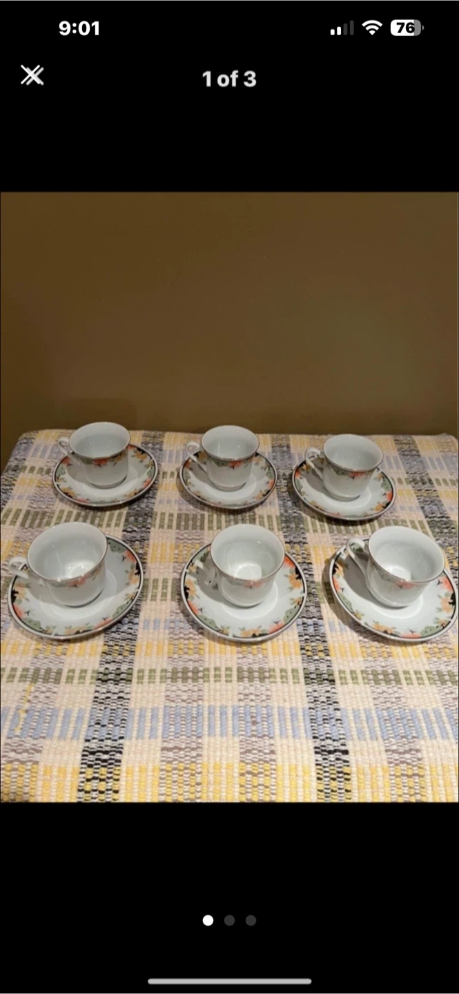 This is a set of six vintage teacups and saucers, featuring a delicate floral pattern with a gold rim. One cup has a small chip on its handle. They're made of ceramic.