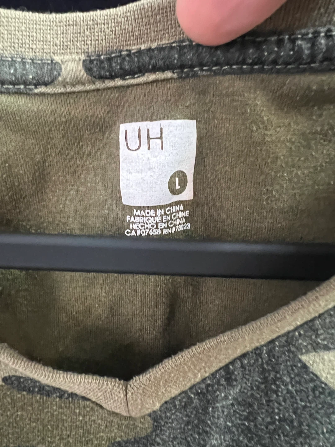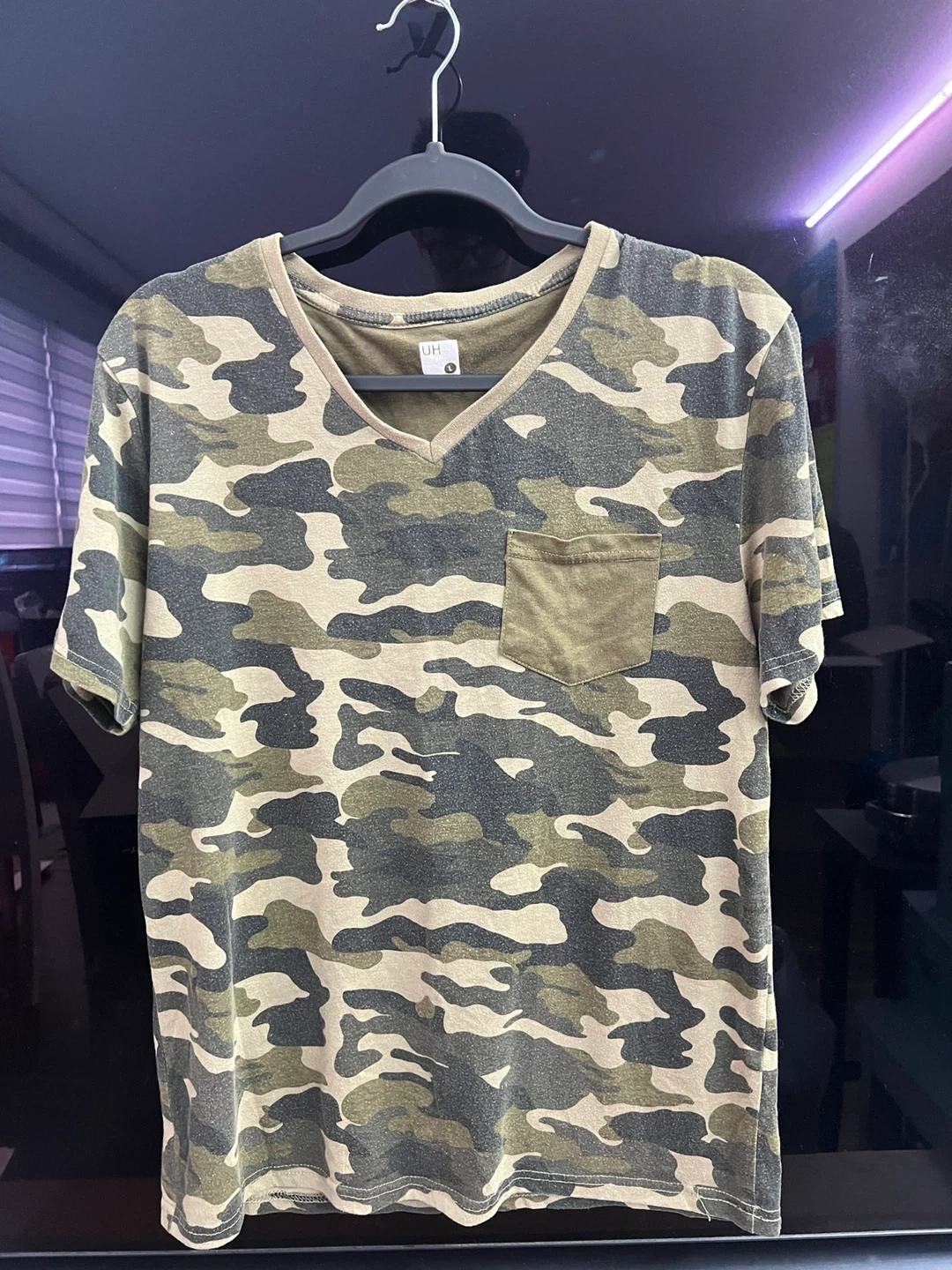 Selling a UH camouflage V-neck t-shirt in size large! It's in great condition and has a cool camo pattern. Perfect for casual wear or layering. Check it out!