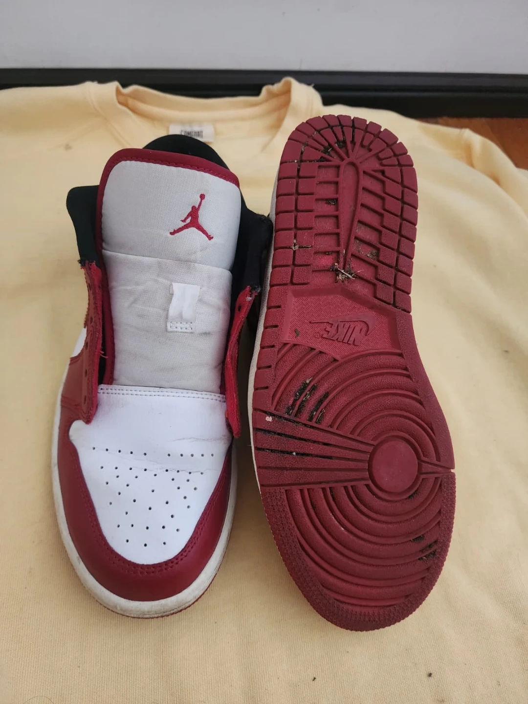 These are Air Jordan 1 Low SE sneakers in red, white, and black. They feature the iconic Jumpman logo on the tongue and the Air Jordan logo on the heel. Rubber sole with Nike branding. shoelaces missing