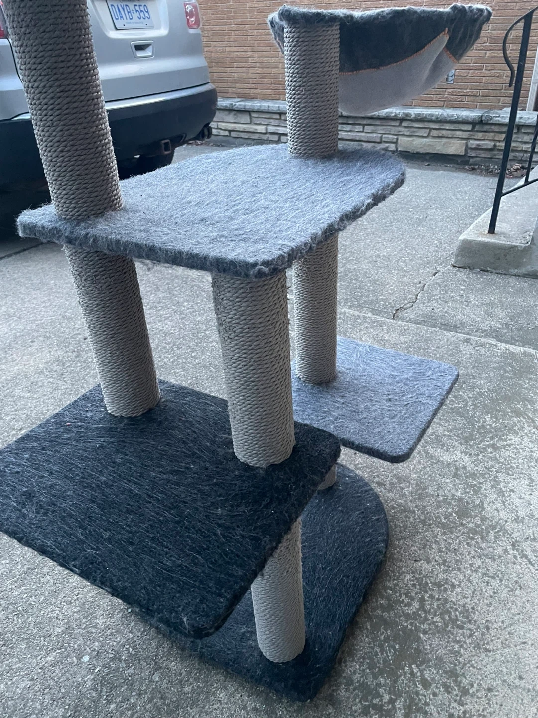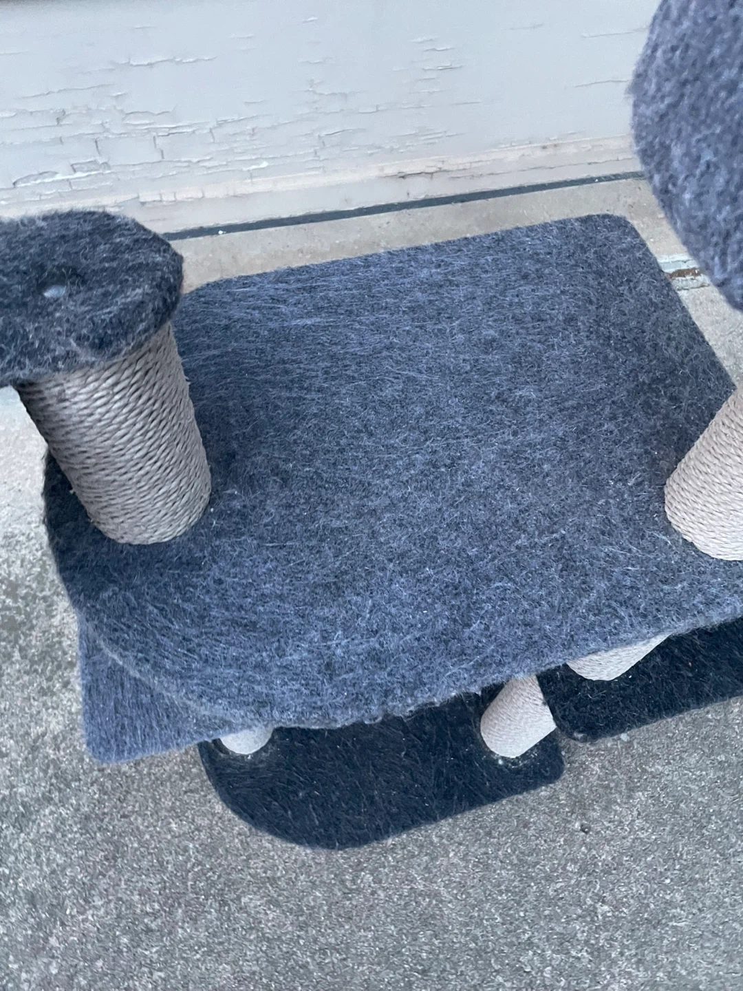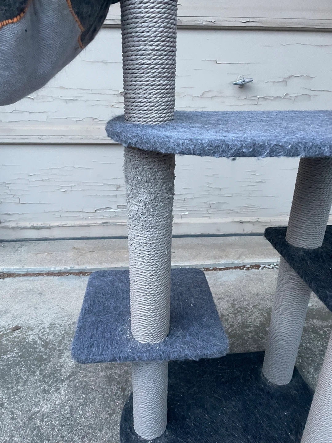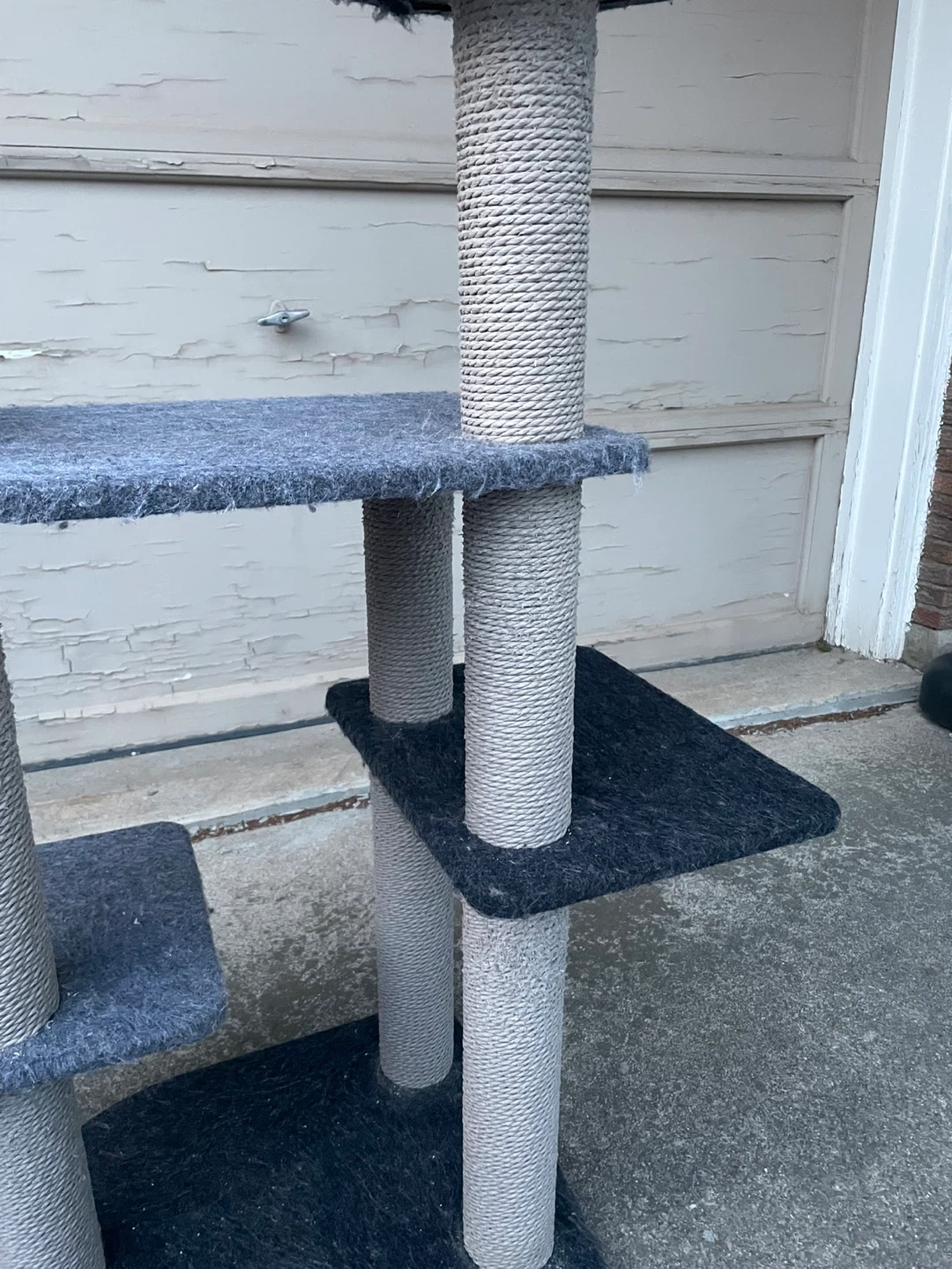This multi-level cat tree offers plenty of space for your feline friend to play and relax. It features multiple perches, a cozy condo, and scratching posts wrapped in durable rope. The soft, grey carpet material provides a comfortable surface for lounging and climbing. Cats will love exploring and napping on this fun structure!57 inch