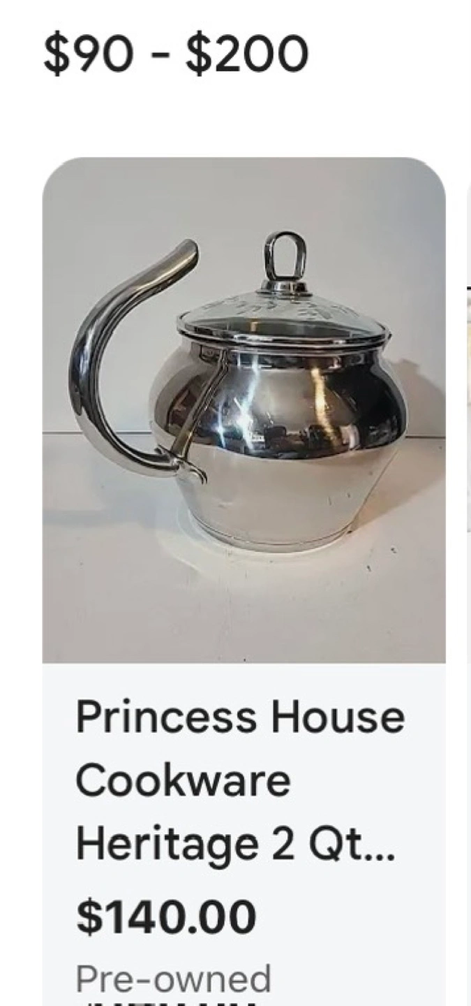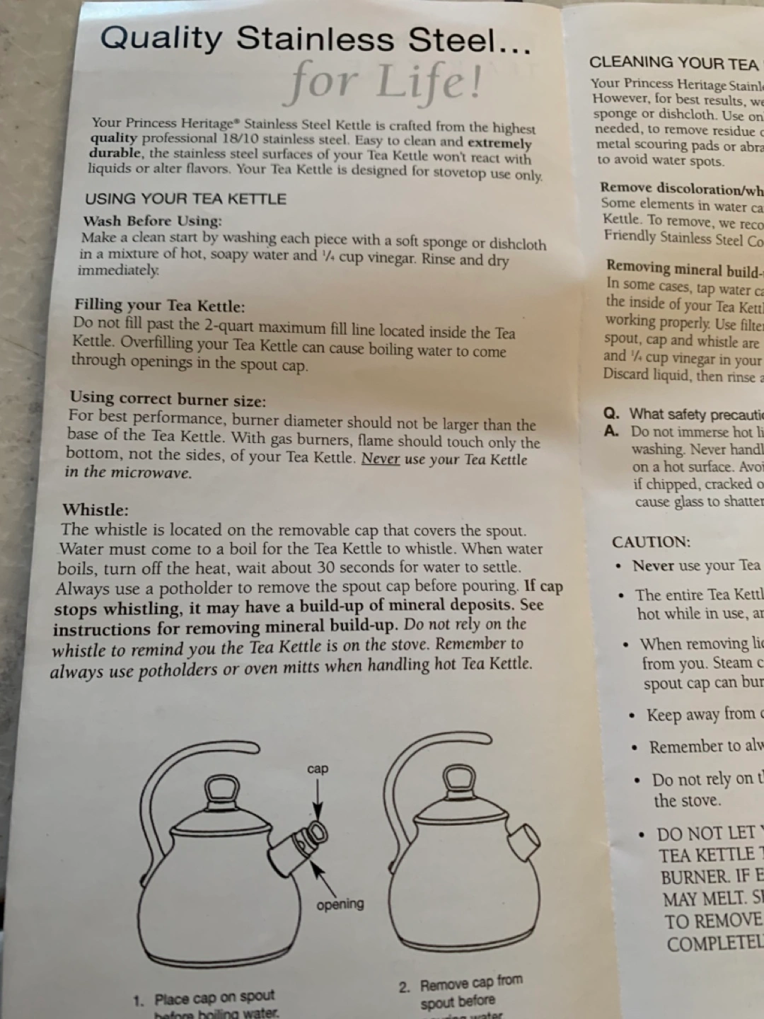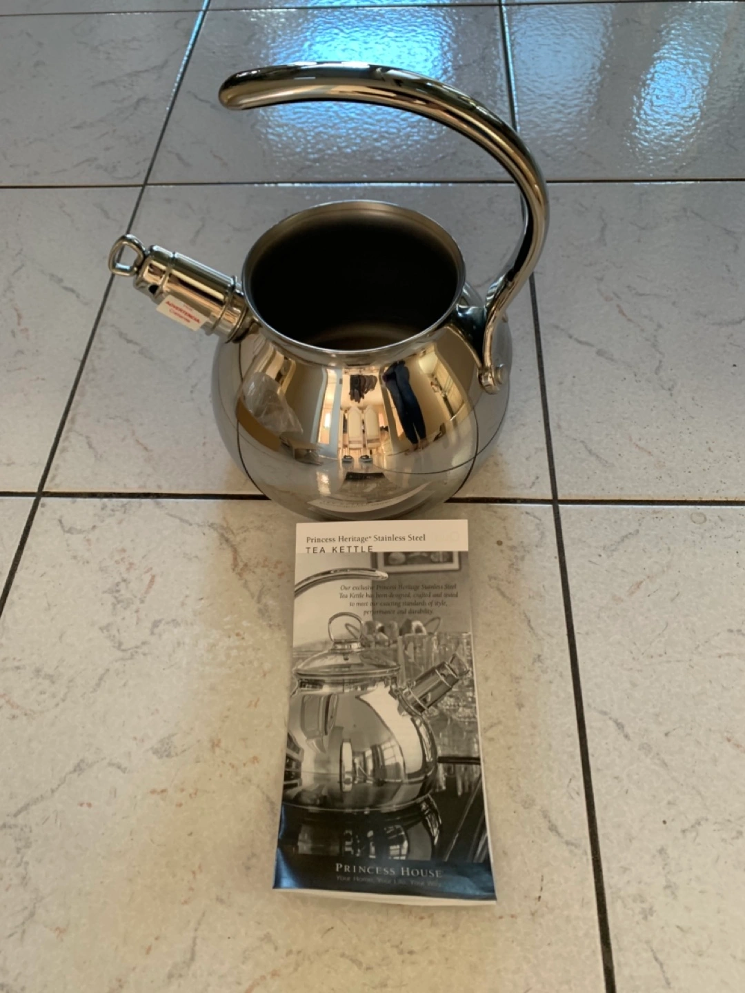 Princess House Heritage 2-quart stainless steel tea kettle. Features a curved handle and whistling spout. Includes care instructions.