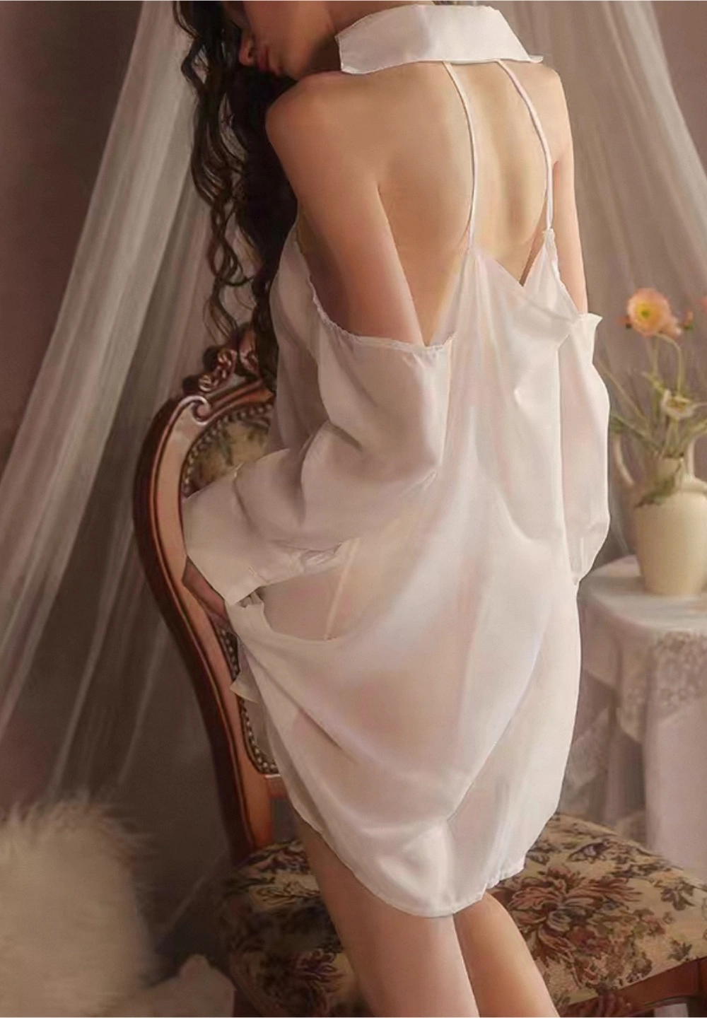 Sheer white fabric chemise with a button-up front and halterneck design. Features cold shoulder long sleeves. It's lightweight and flowy. This piece adds a touch of elegance to your nightwear.