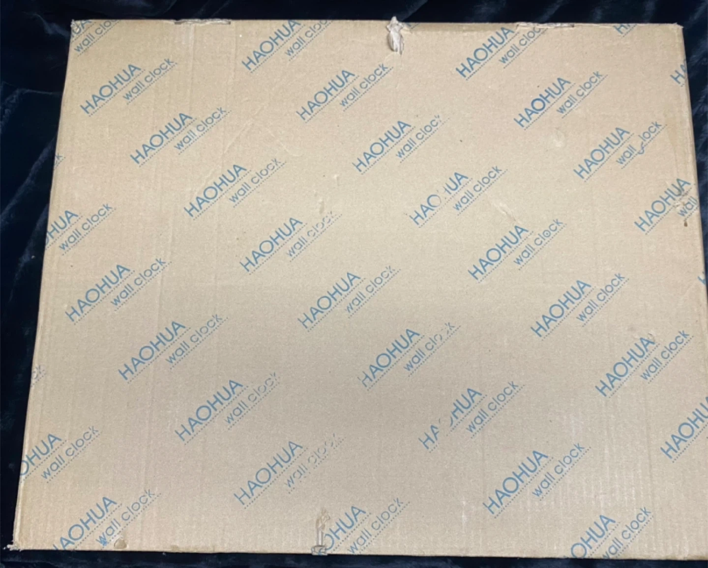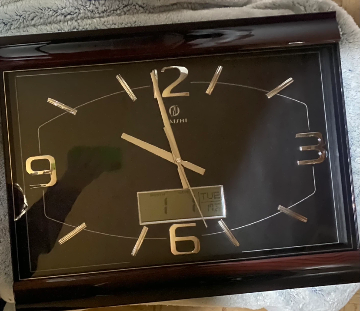 This HAOHUA wall clock features a classic analog display with modern digital readouts. It's housed in a dark wood-effect frame. The clock shows the time, date, and day of the week. It runs on a quartz movement and includes a Panasonic AA battery.