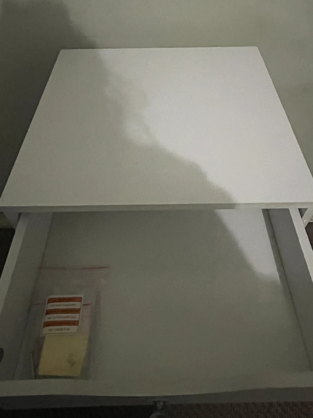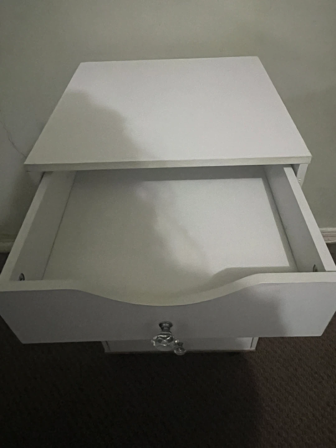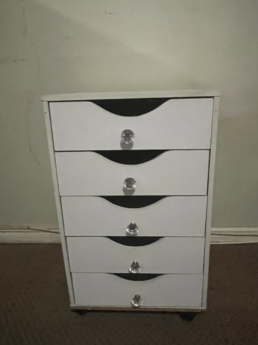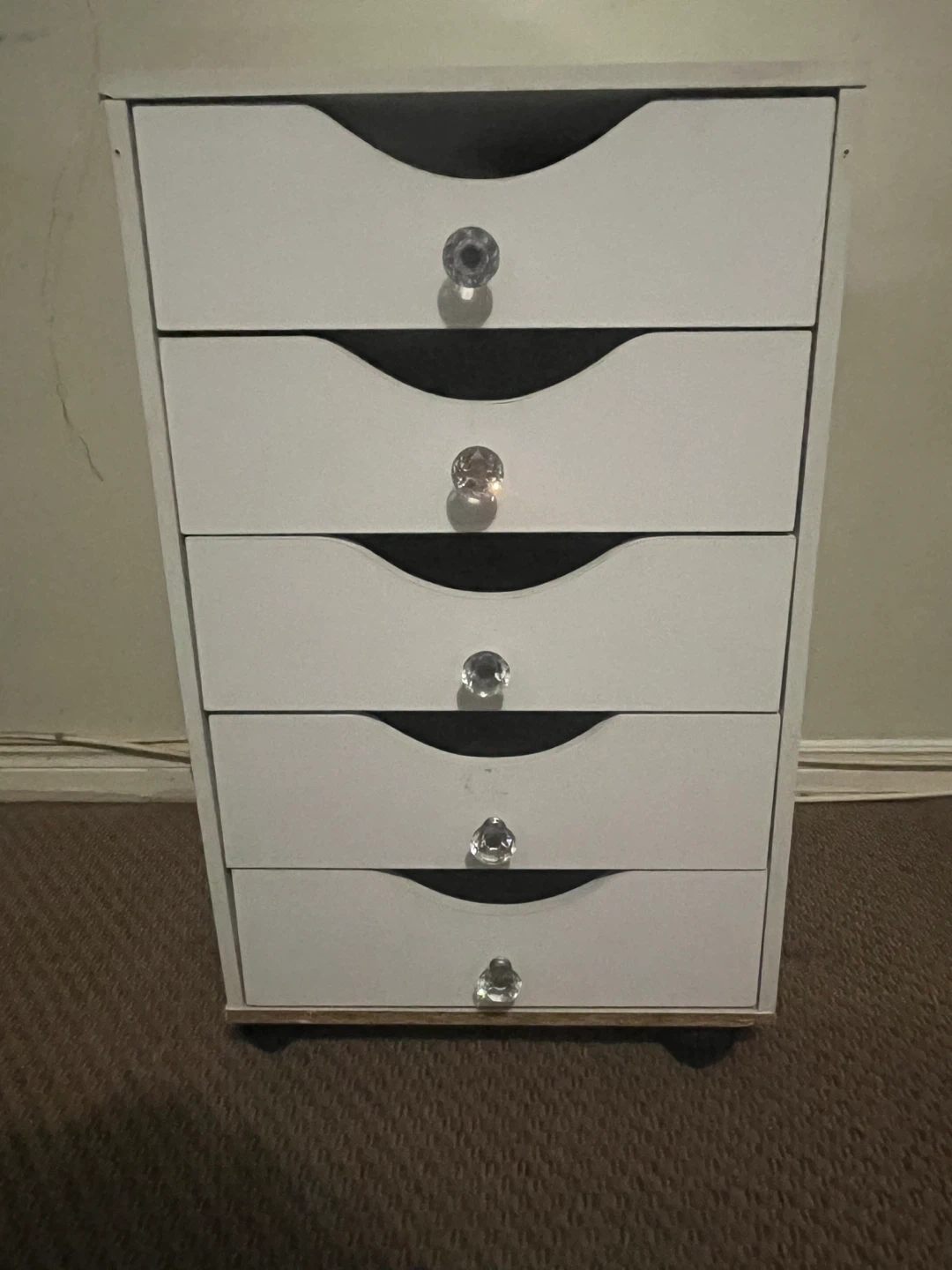 White five-drawer storage unit with crystal knobs. It's great for organizing small items. Each drawer is a good size for various supplies. (Little wear and tear other than that it’s in great condition)