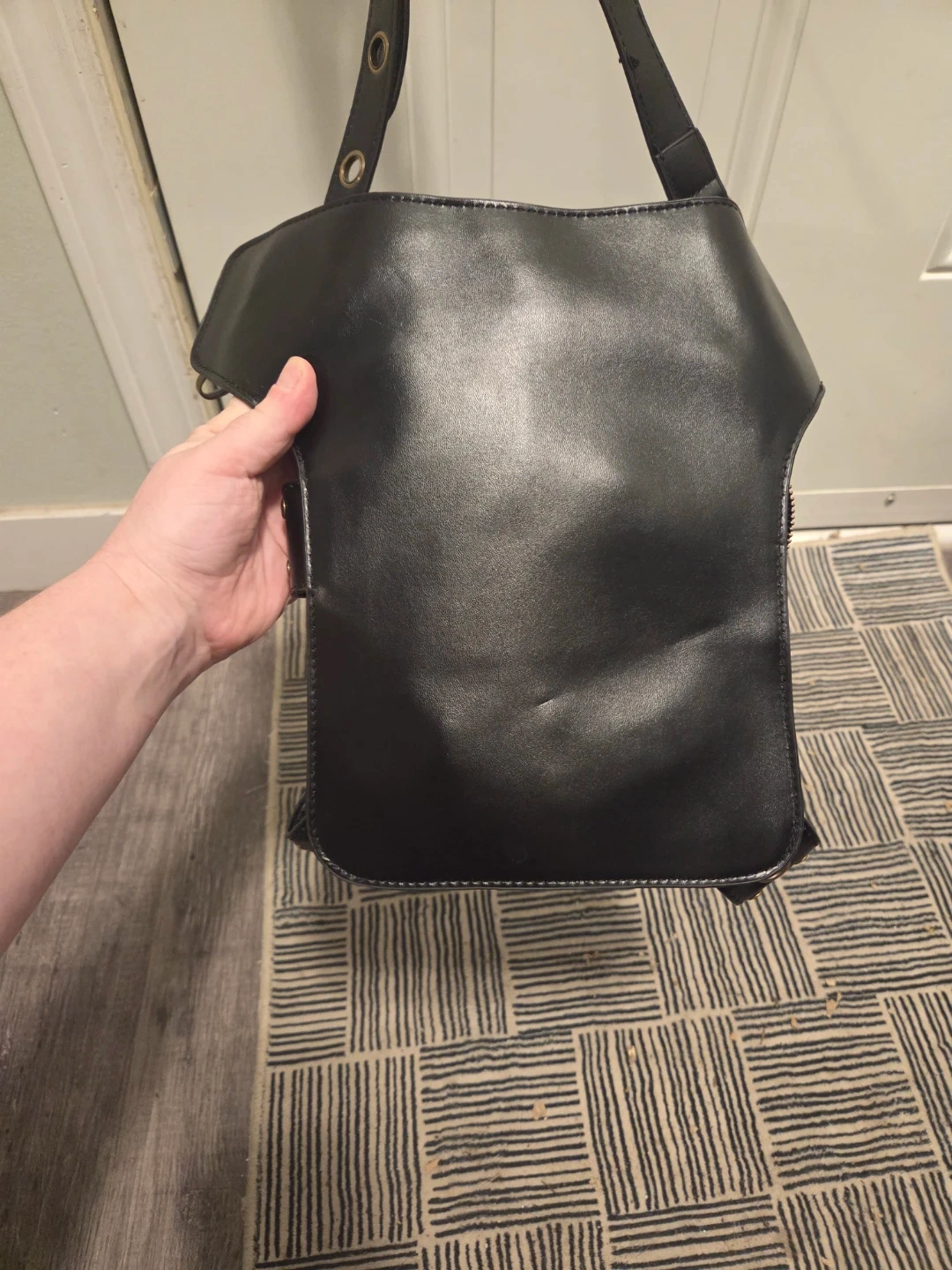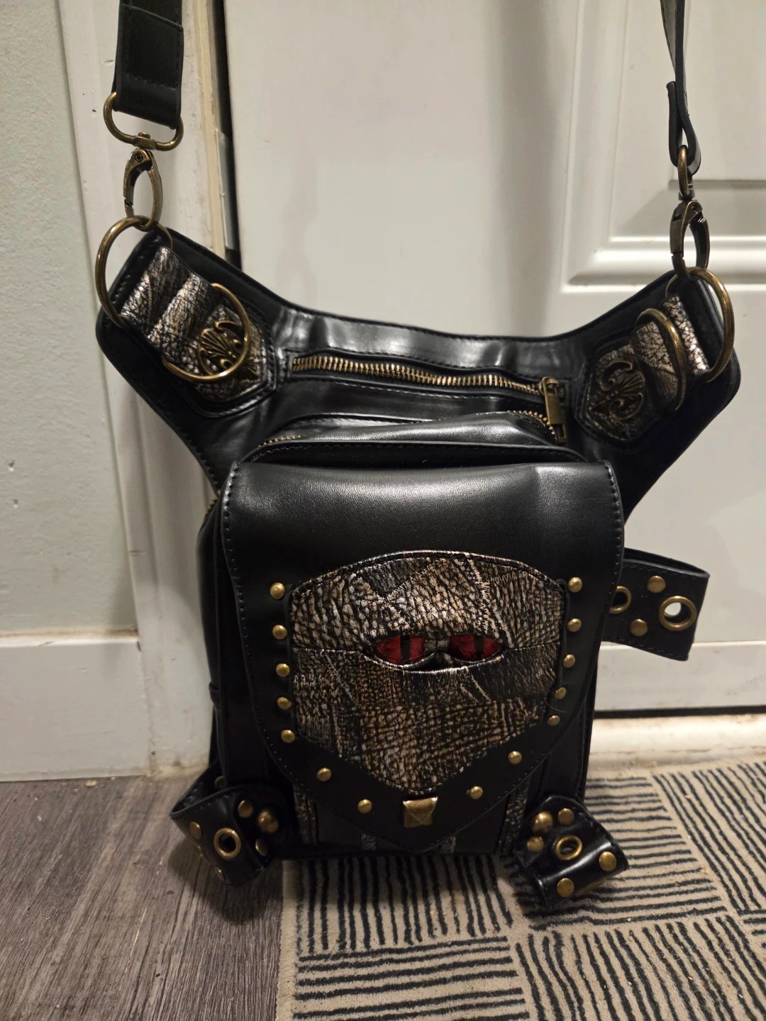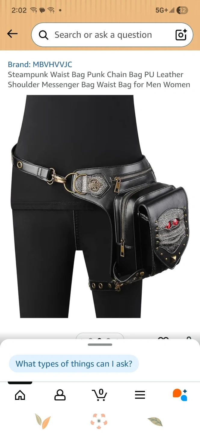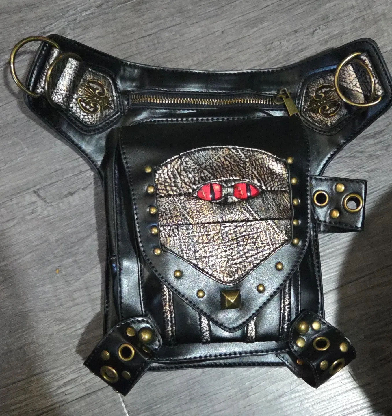 This black PU leather waist bag features a unique steampunk design It has a zippered main compartment and additional pockets. Adjustable straps allow it to be worn around the waist or as a leg bag this bag sell for 71 dollars on Amazon
