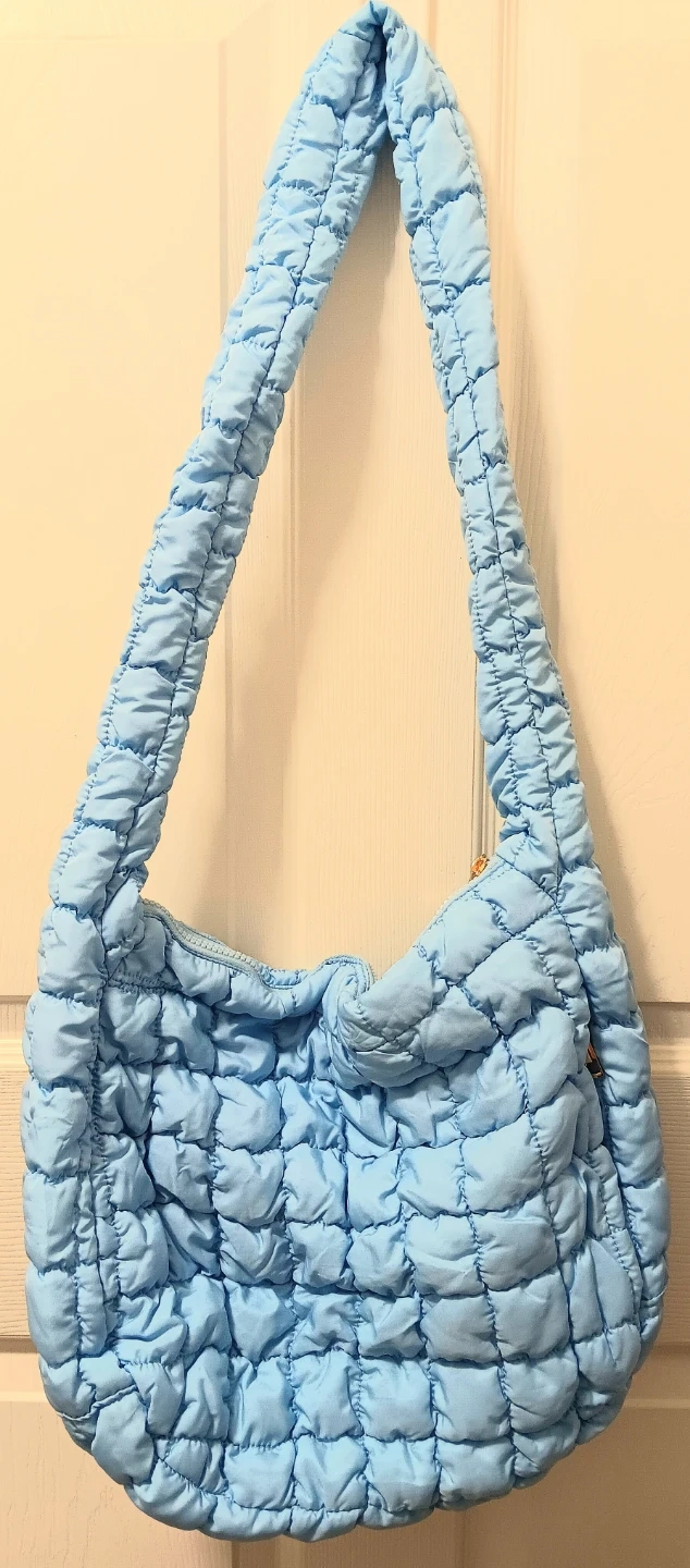 This is a light blue quilted bag is in new condition, with a zip closure. It's the perfect accessory for adding a pop of colour to your outfit. It's approximately 15 inches wide and 11 inches tall.