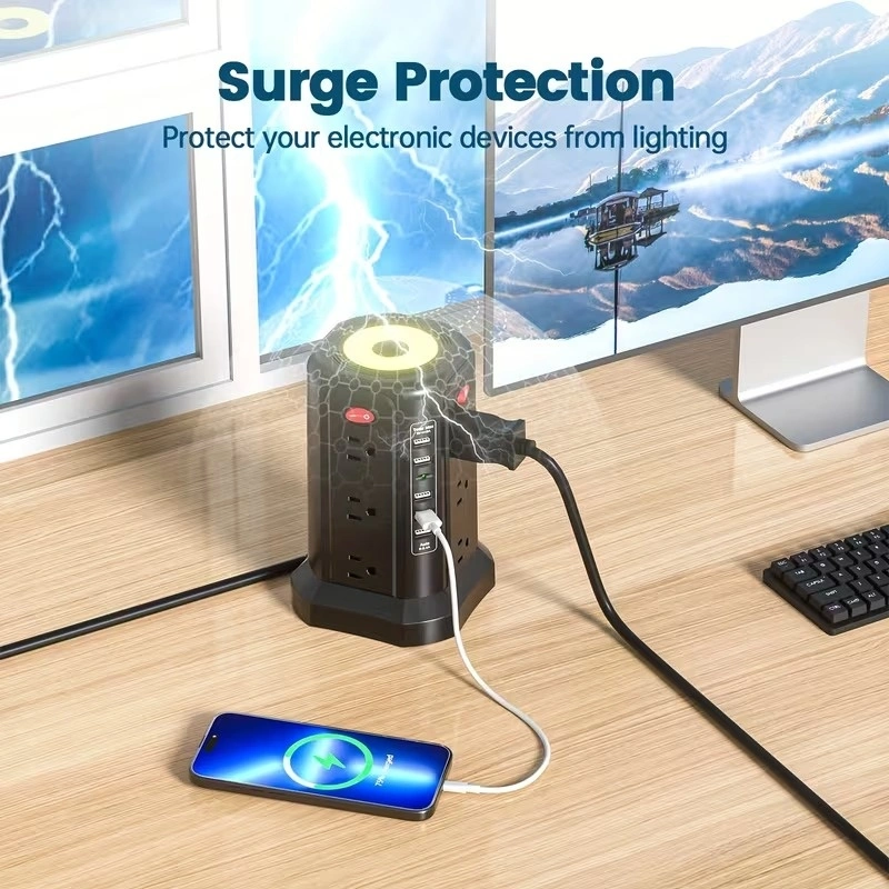 Power all your devices from one convenient hub. Features multiple AC outlets, 5 USB ports with PD18W/20W fast charging, and a long 10ft extension cord for flexible placement. Built-in surge protection and a soft night light add extra safety and convenience—perfect for home, office, or dorm use.