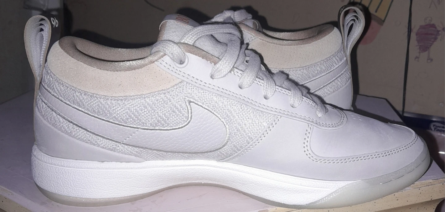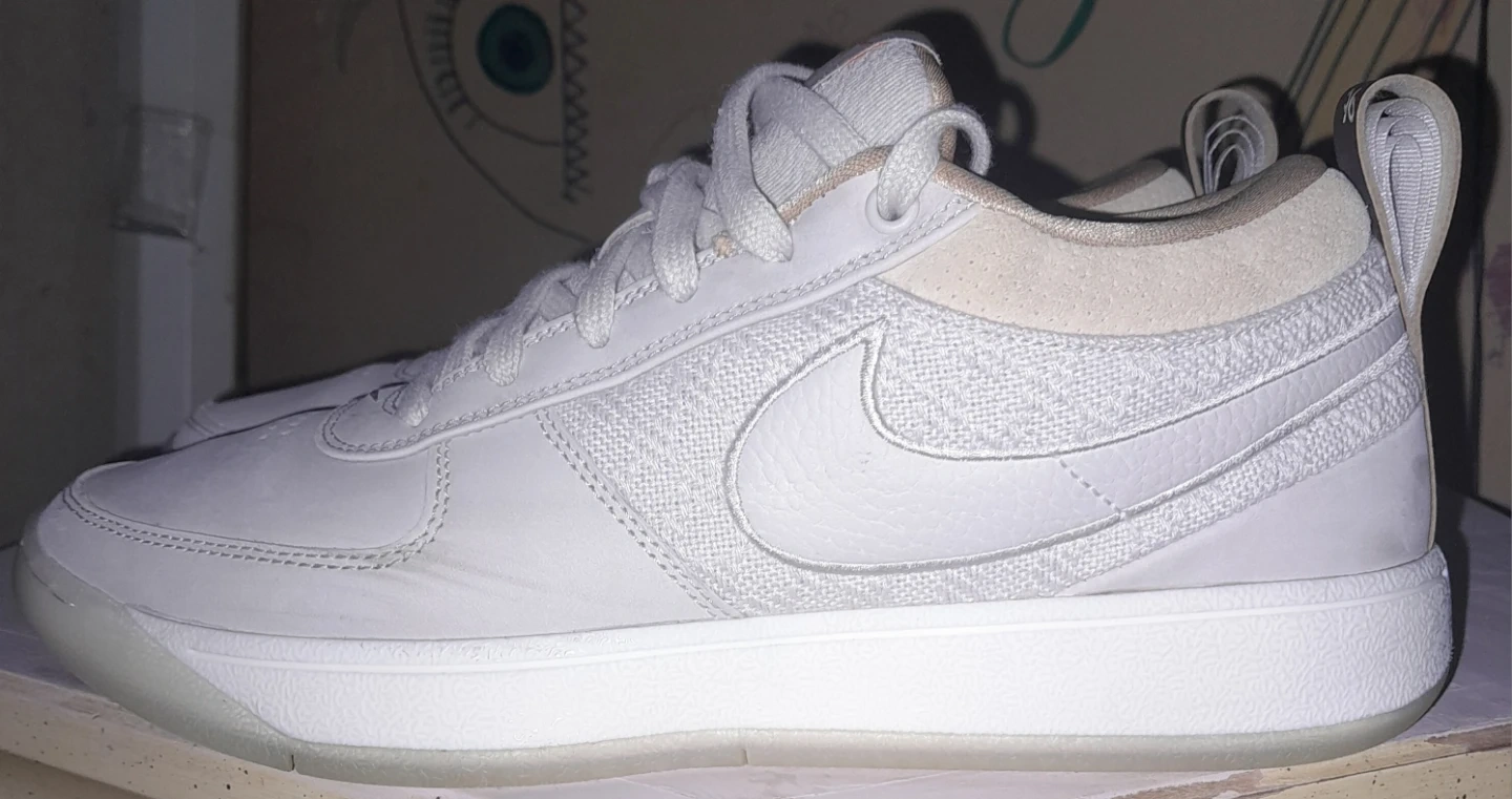 Size 9 mens White Nike SB sneakers with "BOOK" branding on the tongue. They feature a mix of leather and textured fabric panels. This pair has pull tabs on the heel and tongue for easy on and off.